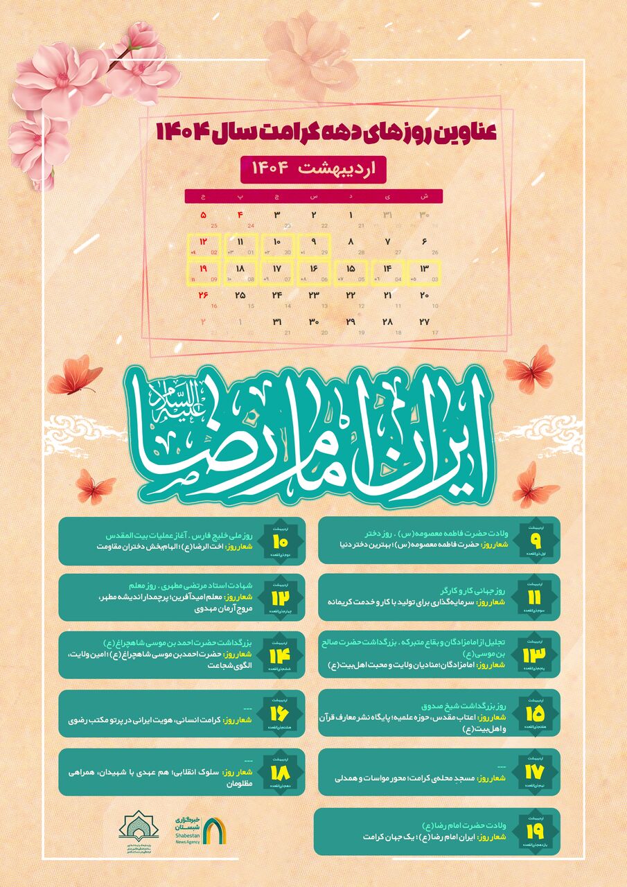 https://shabestan.news/xkrLB ۷ اردیبهشت ۱۴۰۴ - ۰۹:۱۴ کد خبر 1814547 چند رسانهای اینفوگرافیک اینفوگرافی| عناوین روزهای دهه کرامت سال ۱۴۰۴ «ایرانِ امام رضا(ع)» به عنوان شعار محوری دهه کرامت سال ۱۴۰۴ انتخاب شد. برای دانلود نسخه باکیفیت اینجا کلیک کنید کد خبر 1814547 برچسبها اینفوگرافی دهه کرامت عناوین روزهای دهه کرامت