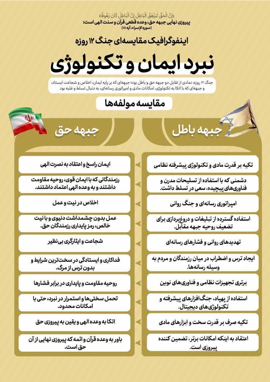 جنگ ۱۲ روزه، نمادی از تقابل دو جبهه حق و باطل بود؛ جبهه‌ای که بر پایه ایمان، اخلاص و شجاعت ایستاد و جبهه‌ای که با اتکا به تکنولوژی، امکانات مادی و امپراتوری رسانه‌ای، به دنبال تسلط و غلبه بود؛ اداره کل حفظ آثار و نشر ارزش‌های دفاع مقدس و مقاومت استان کرمان تازه‌ترین اینفوگرافی را ناظر به این مسئله منتشر کرد.