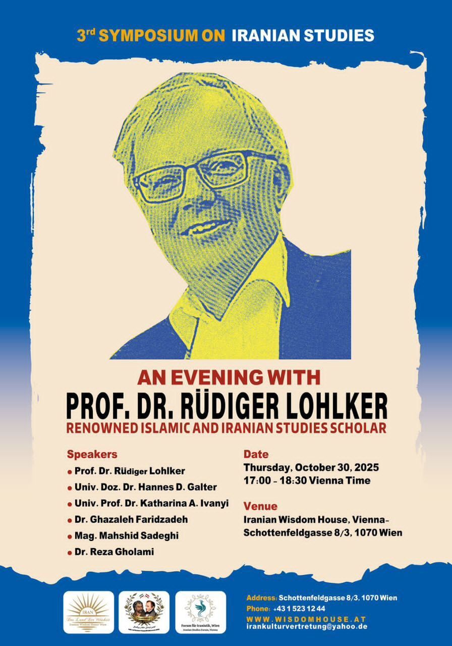به گزارش خبرگزاری شبستان، با همت رایزنی فرهنگی جمهوری اسلامی ایران در اتریش، سومین سمپوزیوم ایرانشناسی با عنوان «شبی با پروفسور رودیگر لولکر؛ اسلامشناس و ایرانشناس برجسته اتریشی» در روز پنجشنبه، ۸ آبان ۱۴۰۴ برابر با ۳۰ اکتبر ۲۰۲۵ در خانه حکمت ایرانیان در وین برگزار میشود.