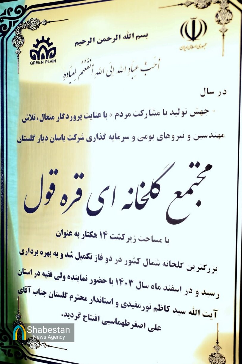 مجتمع گلخانه ای «قره قول» شهرستان گمیشان، امروز (پنجشنبه ٢ اسفند) با حضور نماینده مقام معظم رهبری در استان گلستان و امام جمعه گرگان، استاندار گلستان و جمعی از مسئولان و مدیران استان به بهره برداری رسید. مجتمع گلخانه ای قره قول (سبزی صیفی و پرورش فلفل دلمه) در سال جهش تولید با مشارکت مردم با تلاش مهندسین و نیروهای بومی استان و سرمایه گذاری شرکت یاسان دیار گلستان با مساحت زیر کشت ۱۴ هکتار به عنوان بزرگترین گلخانه شمال کشور در ٢ فاز تکمیل شده و برای بیش از ۲۰۰ نفر اشتغال ایجاد کرده است.