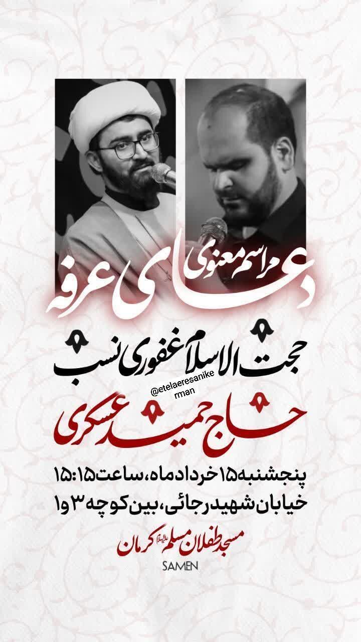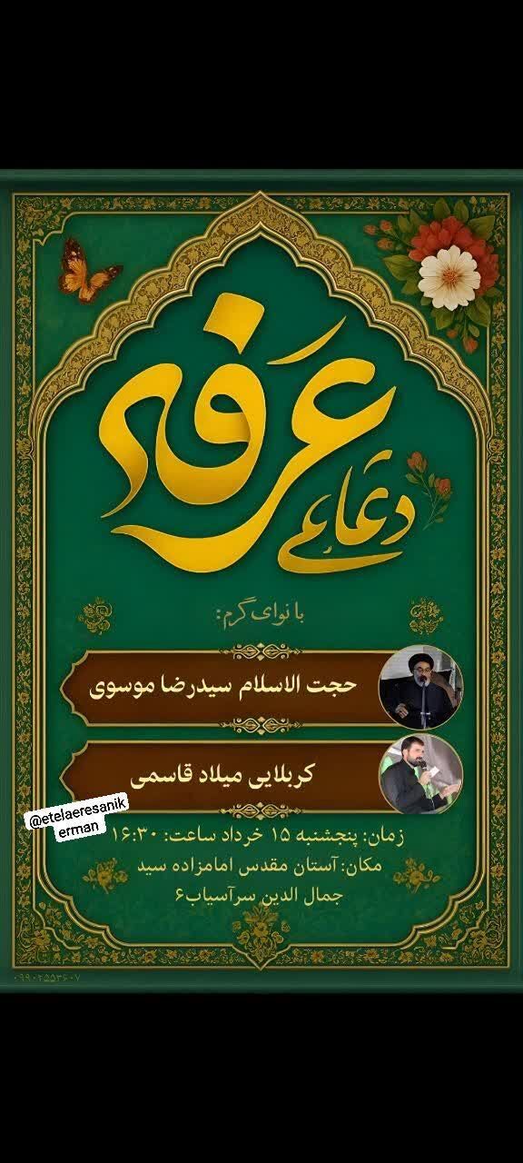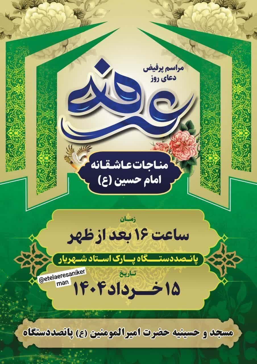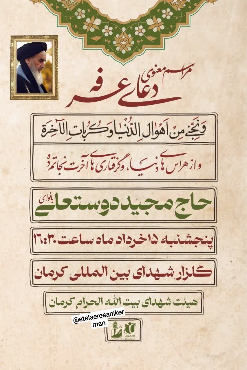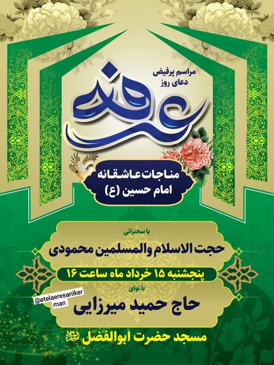 دعای روحبخش عرفه، عصر نهم ذیحجه در صدها نقطه از استان کرمان برگزار می‌شود؛ برخی از این مجالس در قالب پوستر اطلاع‌رسانی شده است.