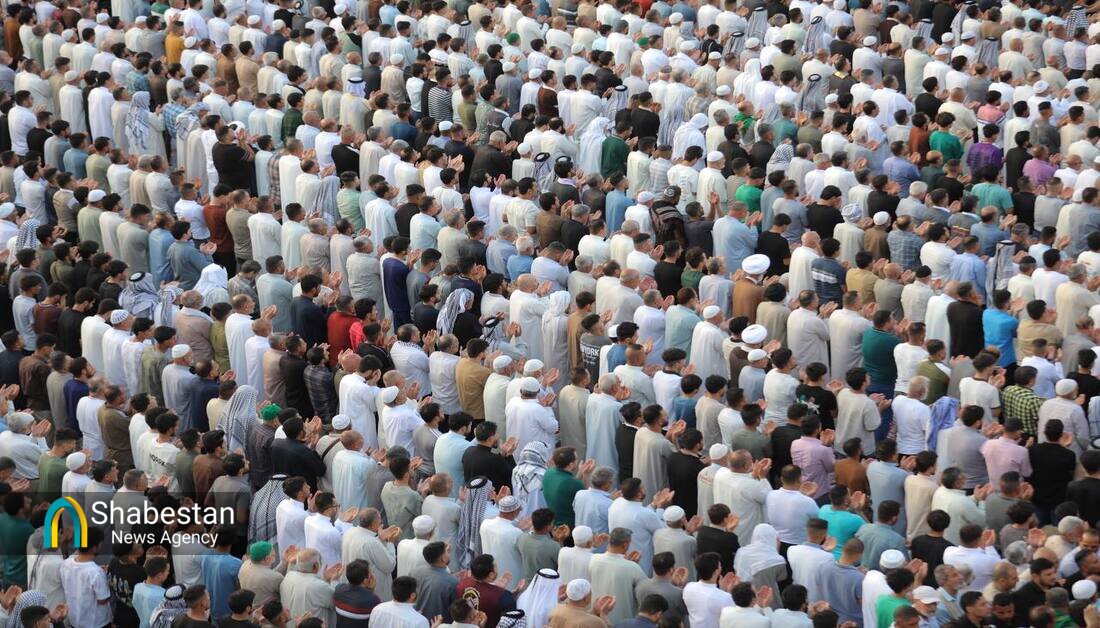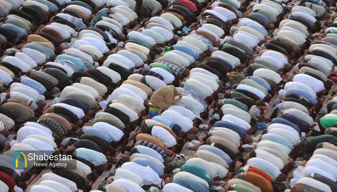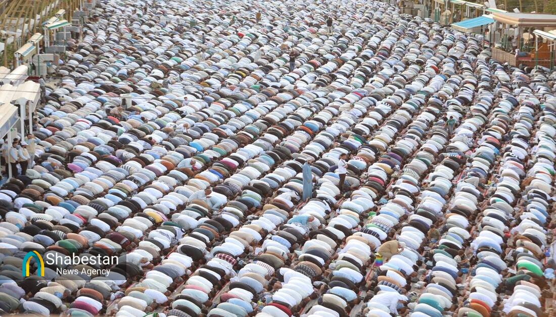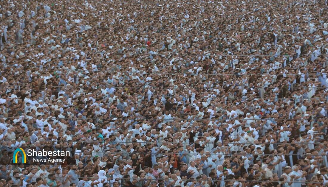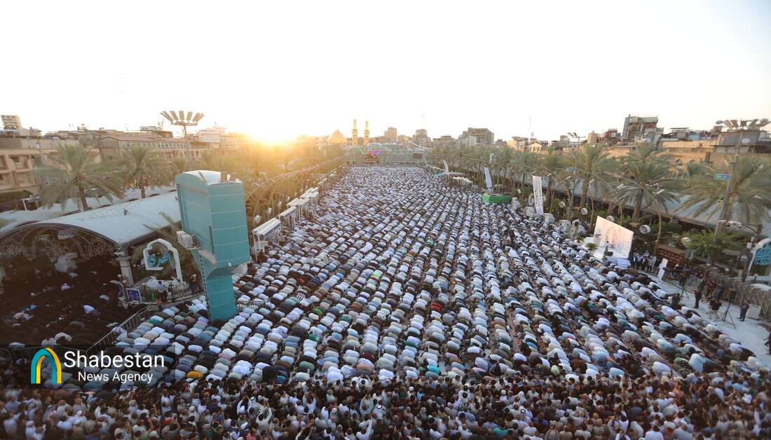 مومنان در فضایی معنوی و دستان دعا رو به آسمان نماز عید قربان را در نزدیکی حرم امام حسین و برادرش حضرت عباس (علیهما السلام) با نوای «لبیک اللهم لبیک» اقامه کردند.