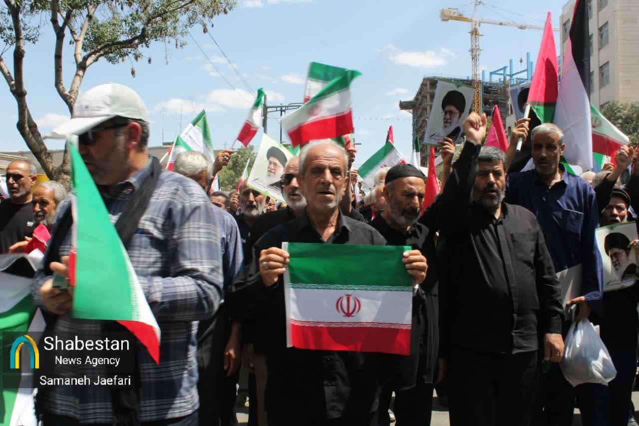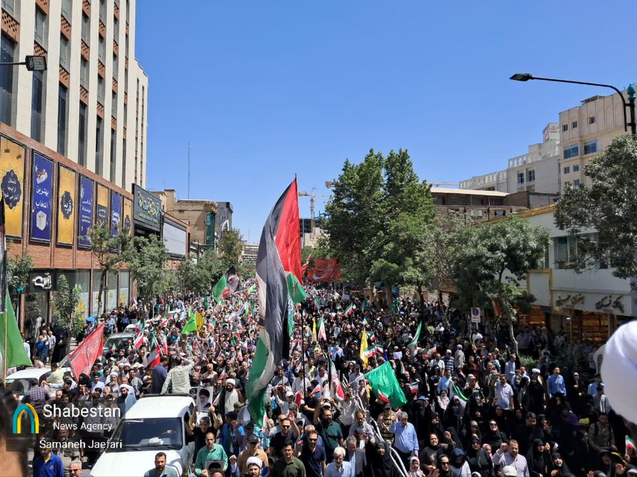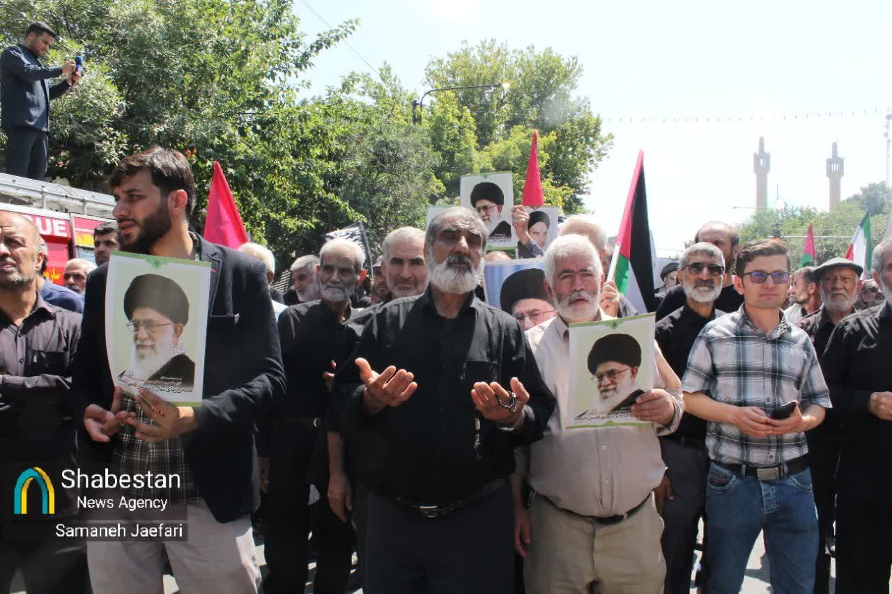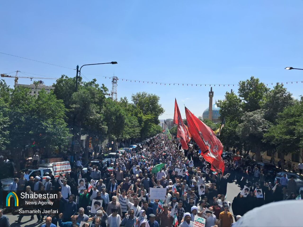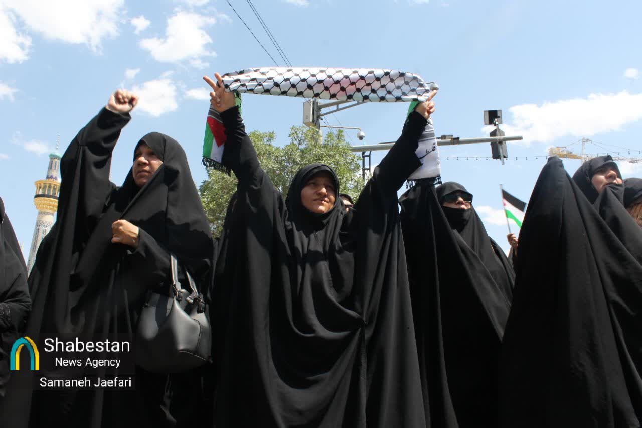 زائران و مجاوران حرم رضوی امروز جمعه ۳۰ خرداد ماه در محکومیت جنایات رژیم غاصب صهیونیستی و یاوهگوییهای رئیس جمهور آمریکا، پس از اقامه نماز جمعه از باب الجواد حرم مطهر رضوی، به سمت چهارراه شهدا راهپیمایی کرده و با شعارهای مرگ بر اسرائیل و مرگ بر آمریکا انزجار و خشم خود را از رژیم صهیونیستی اعلام و با فریادهای حیدر حیدر با تجدید بیعت با ولایت، آمادگی خود را بر مقابله علیه دشمنان وطن اعلام کردند.