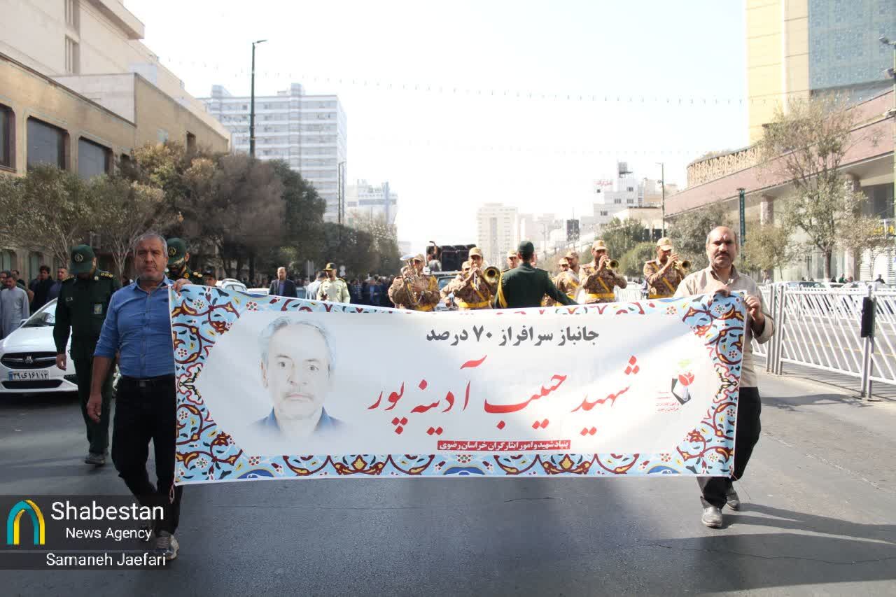 مراسم تشییع و تدفین پیکر مطهر شهید «حبیب آدینه پور» جانباز ۷۰ درصد دوران دفاع مقدس صبح امروز دوشنبه ۲۸ مهرماه با حضور پرشور مردم مؤمن و خانوادههای شهدا و ایثارگران از مقابل مهدیه مشهد مقدس واقع در خیابان امام رضا (ع) به سمت حرم مطهر رضوی برگزار و پیکر مطهر آن شهید والامقام پس از طواف در بارگاه منور امام رضا (ع) و اقامه نماز، در گلزار شهدای بهشت رضوان مشهد مقدس به خاک سپرده شد. جانباز شهید «حبیب آدینهپور» در دوم خردادماه ۱۳۴۴ در شهرستان بجنورد به دنیا آمد و در ۱۳ آبان ۱۳۶۱ در جریان عملیات دفاع مقدس بر اثر اصابت ترکش به ناحیه گردن، دست و پا به مقام والای جانبازی نائل آمد و پس از سالها مجاهدت در مسیر خدمت و صبر، در تاریخ ۲۶ مهرماه ۱۴۰۴ به یاران شهیدش پیوست.