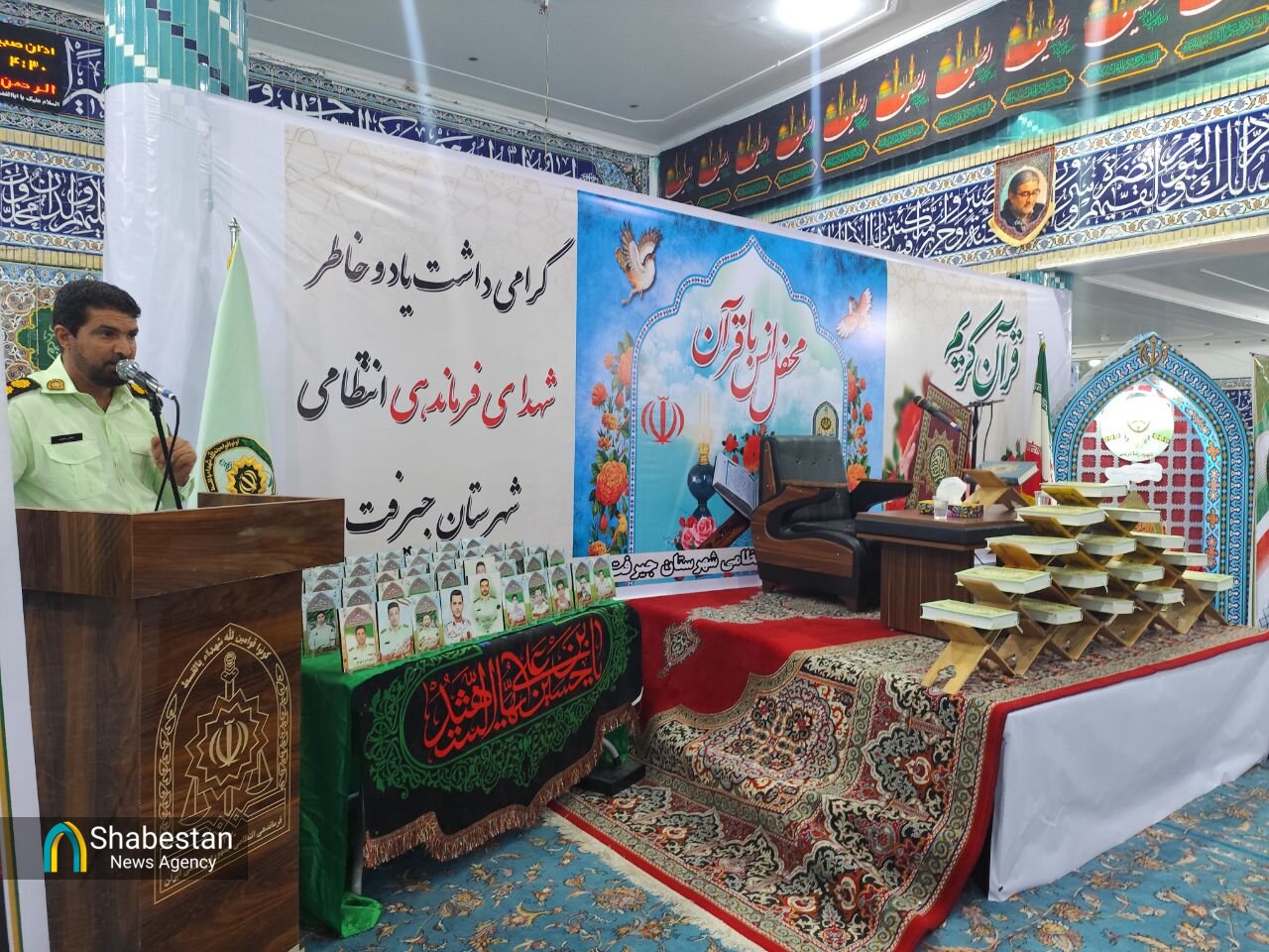 محفل انس با قرآن کریم یادبود شهدای فرماندهی انتظامی شهرستان جیرفت به همت عقیدتی سیاسی انتظامی شهرستان جیرفت با حضور حجت الاسلام محمدی قاری بین المللی و حسین خالصی قاری کشوری در مسجد امام علی (ع) شهرک شهید بهشتی جیرفت برگزار شد.