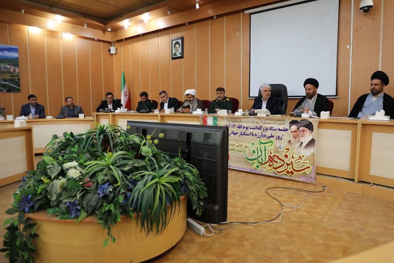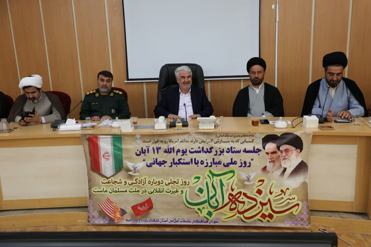 نشست ستاد برنامه ریزی بزرگداشت یوم‌ الله ۱۳ آبان، روز جهانی مبارزه با استکبار جهانی امروز ۴ آبان‌ ماه ۱۴۰۴، با حضور دستگاه های مختلف در سالن شماره یک استانداری کهگیلویه و بویراحمد برگزار و مصوب شد مراسم راهپیمایی یوم‌الله ۱۳ آبان در همه مراکز شهرستان‌ها، بخش‌ها و تعدادی از روستاهای استان با حضور اقشار مختلف مردم برگزار شود که این راهپیمایی در مرکز استان و شهر یاسوج، روز سه‌شنبه ۱۳ آبان ساعت ۹:۳۰ صبح از میدان هفت تیر به سمت خیابان جمهوری اسلامی برگزار خواهد شد.