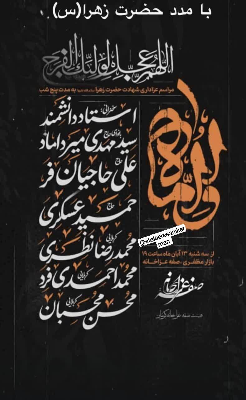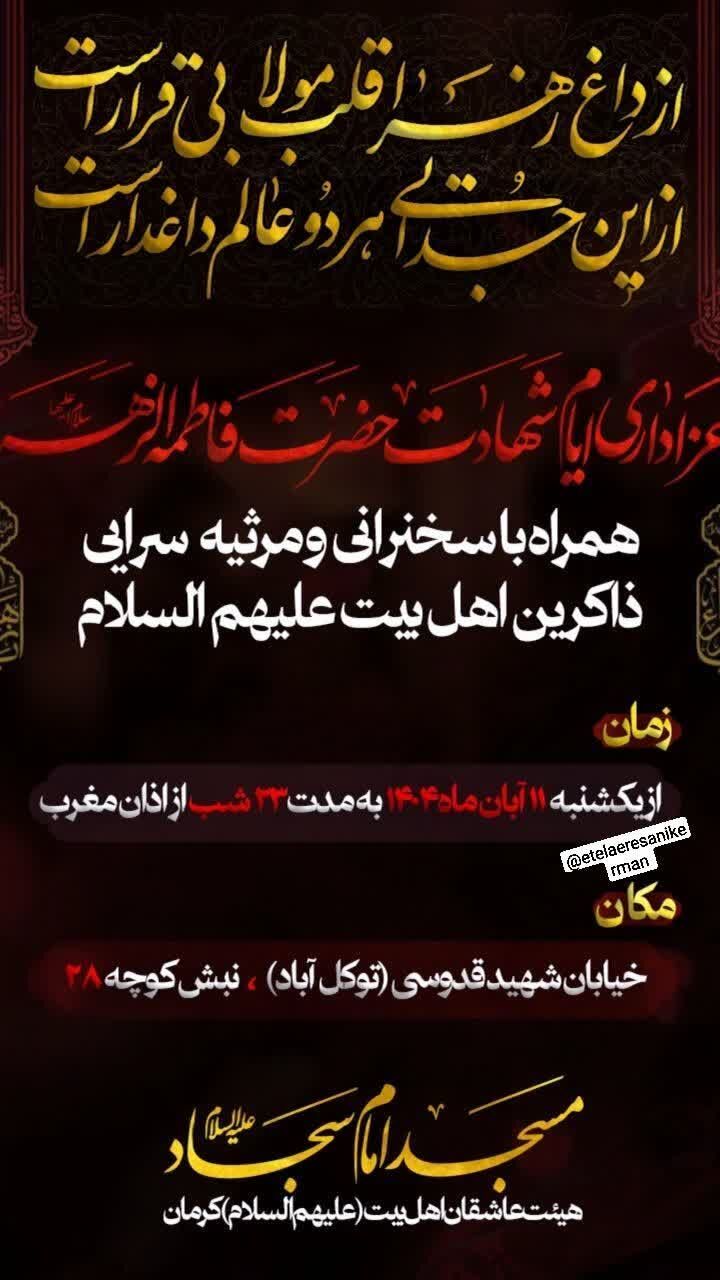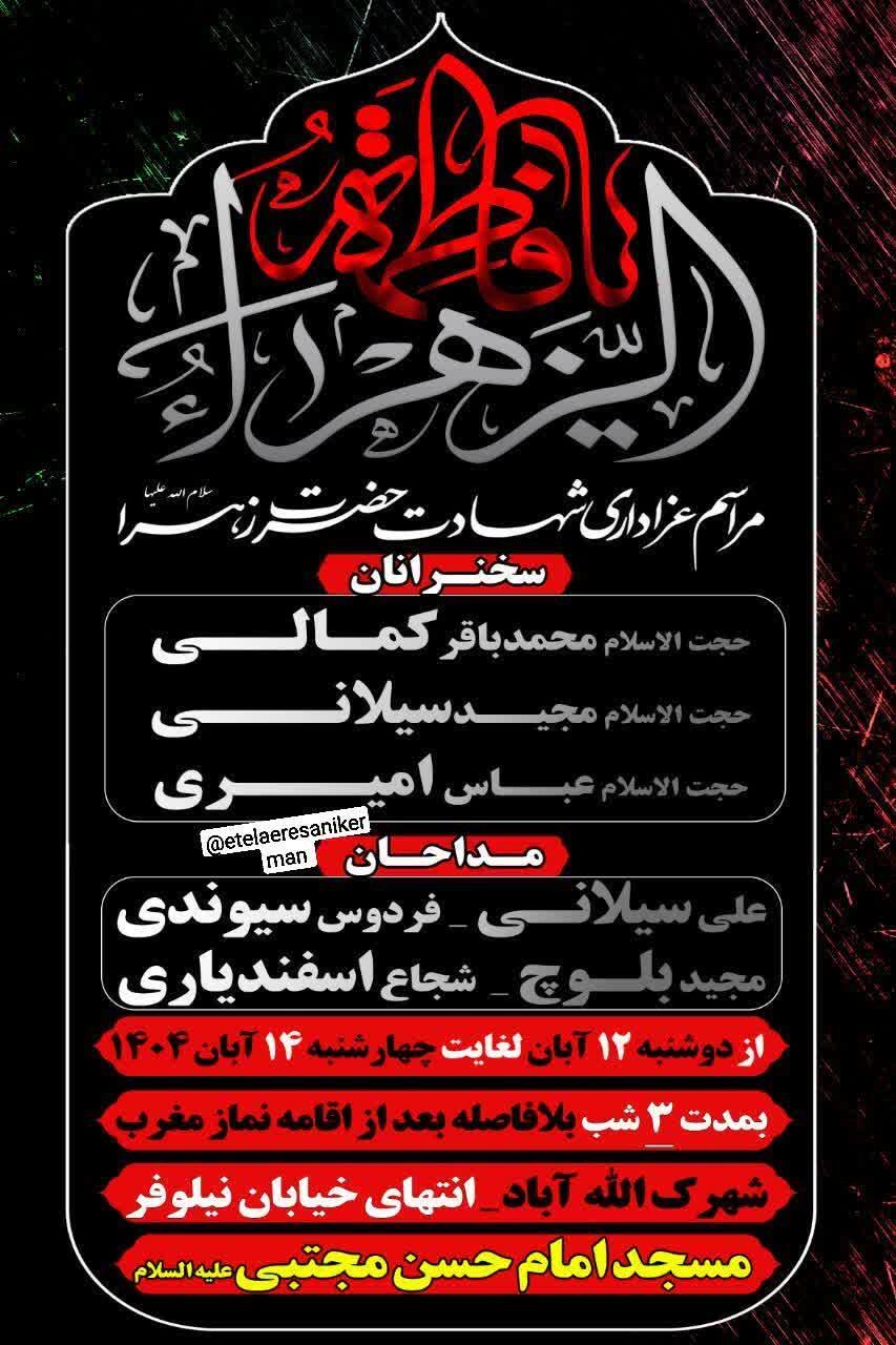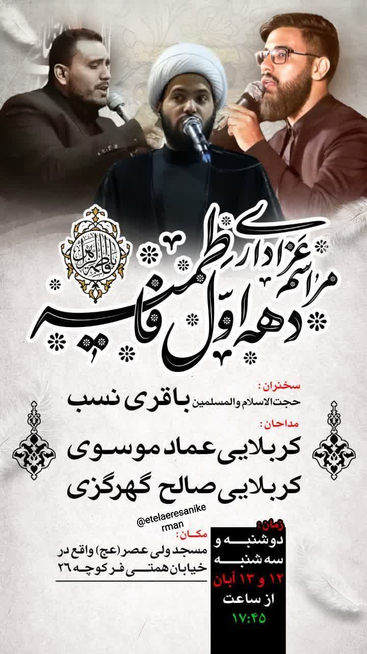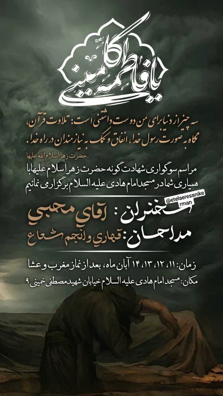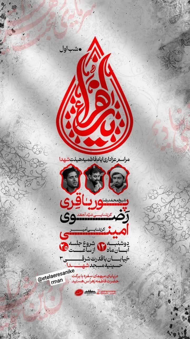 استانها کرمان ۱۲ آبان ۱۴۰۴ - ۱۷:۱۰ دریافت تصاویر برنامههای مساجد و هیئات کرمان در فاطمیه اول همزمان با ایام فاطمیه اول مساجد و هیئتهای مذهبی کرمان در نقاط مختلف شهر مراسم عزاداری و سوگواری برگزار میکنند. برچسبها خبرگزاری شبستان کرمان مراسم فاطمیه اول مساجد و هیئات کرمان اخبار مرتبط معرفت فاطمی؛ شاهکلید زیست عفیفانه