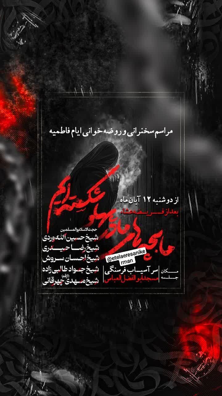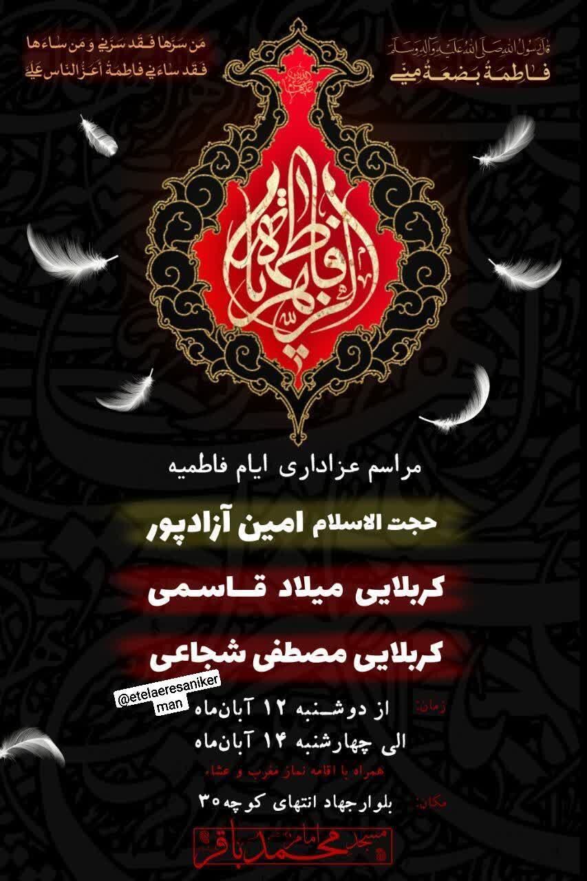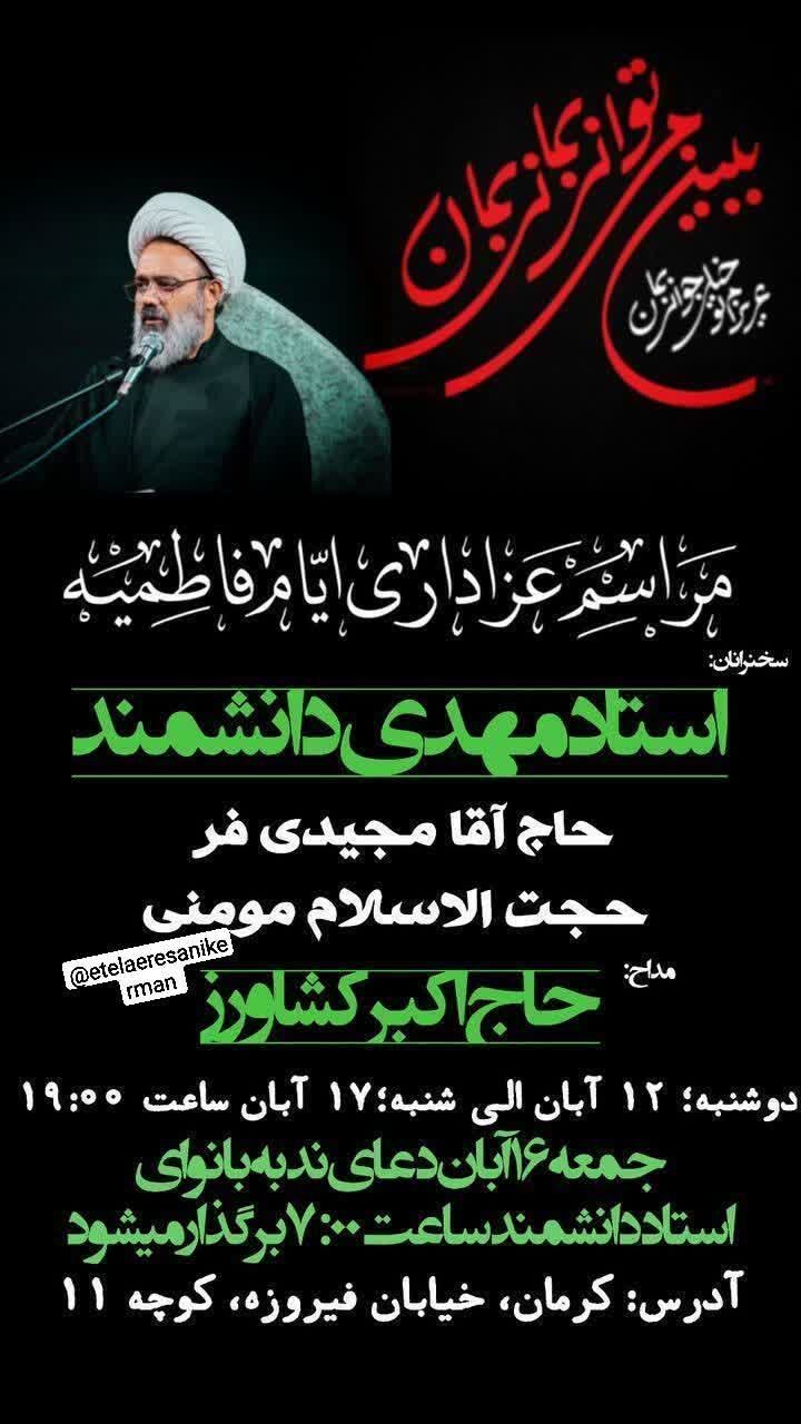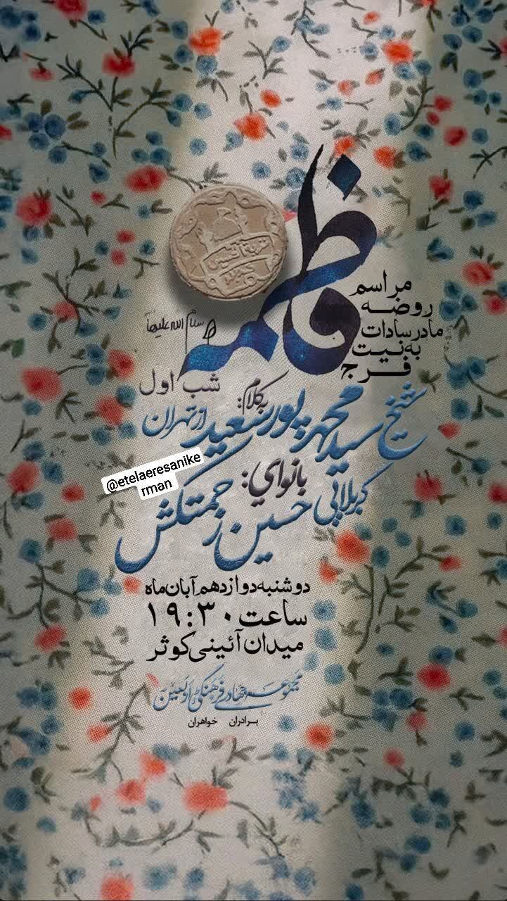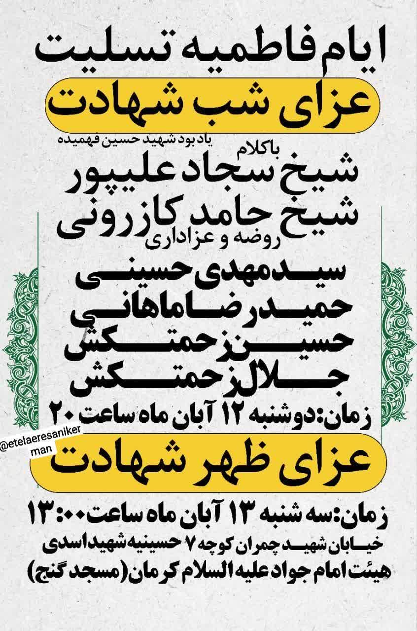 استانها کرمان ۱۲ آبان ۱۴۰۴ - ۱۷:۱۰ دریافت تصاویر برنامههای مساجد و هیئات کرمان در فاطمیه اول همزمان با ایام فاطمیه اول مساجد و هیئتهای مذهبی کرمان در نقاط مختلف شهر مراسم عزاداری و سوگواری برگزار میکنند. برچسبها خبرگزاری شبستان کرمان مراسم فاطمیه اول مساجد و هیئات کرمان اخبار مرتبط معرفت فاطمی؛ شاهکلید زیست عفیفانه