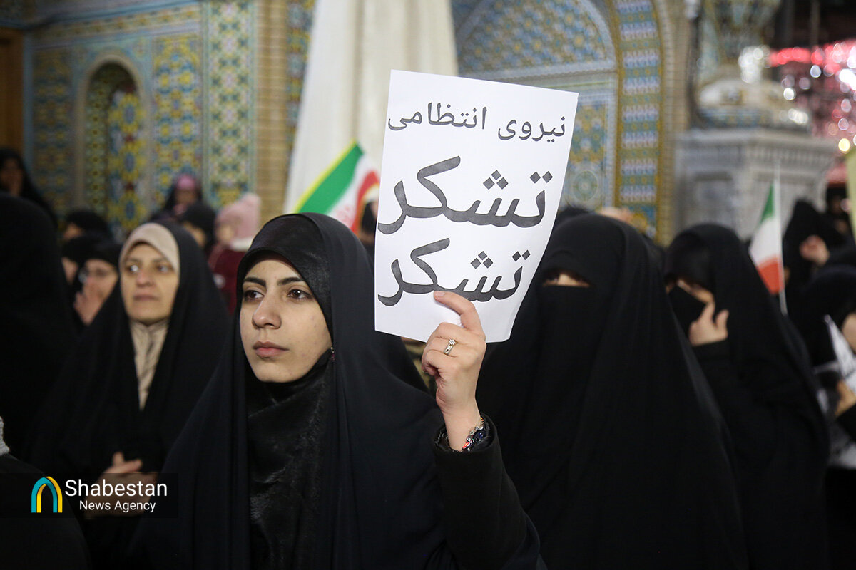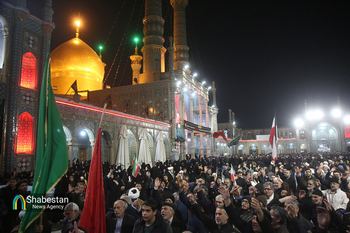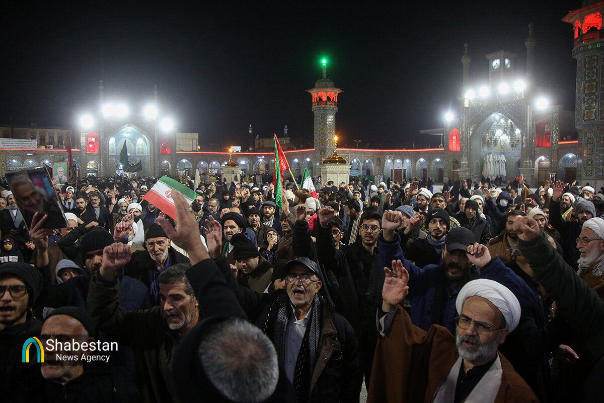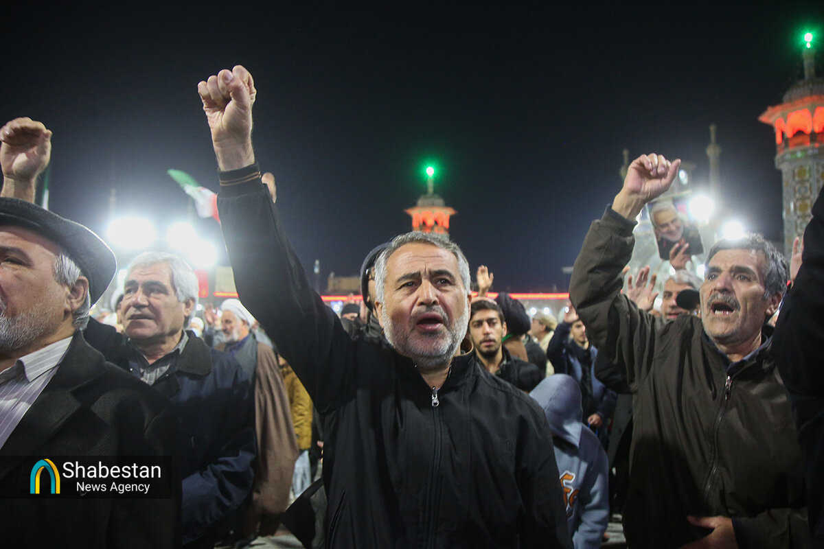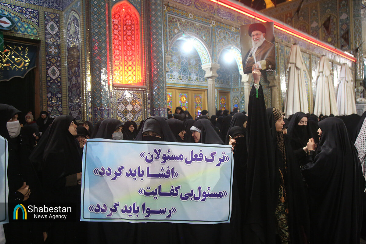 مردم انقلابی و همیشه در صحنه قم با همراهی هیئتهای مذهبی همزمان با شام رحلت حضرت زینب کبری سلام الله علیها با حضور پرشور در صحن امام رضا علیه السلام حرم مطهر حضرت فاطمه معصومه سلام الله علیها علیه اغتشاش گران و برهنه زنندگان نظم کشور تجمع کردند.