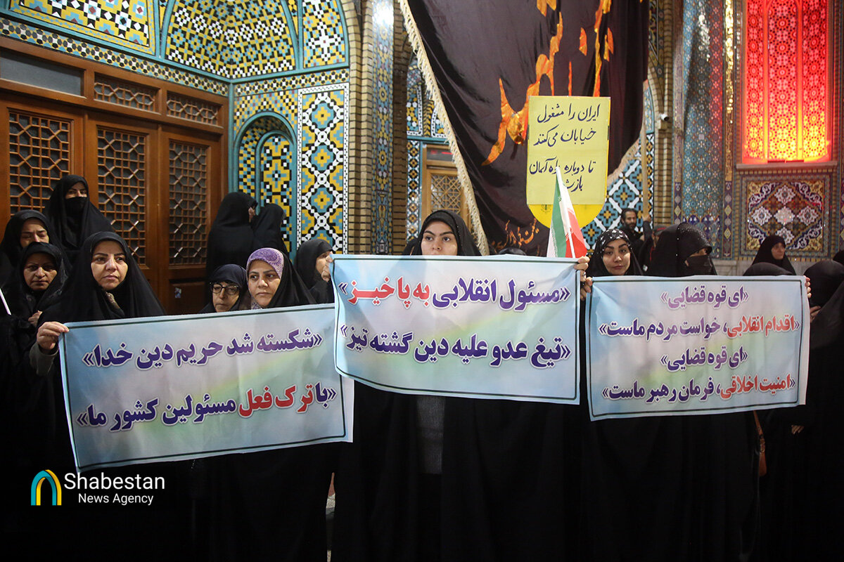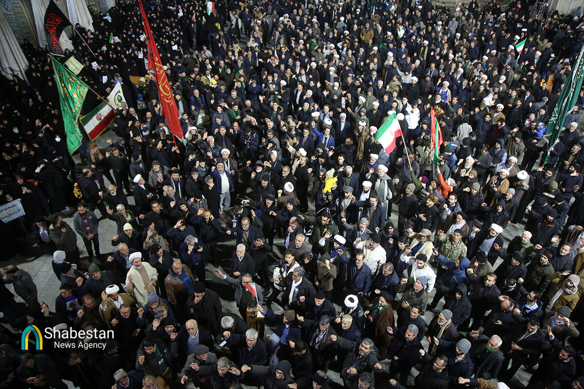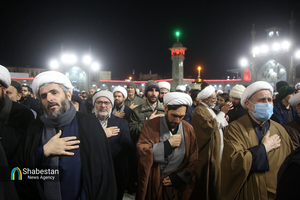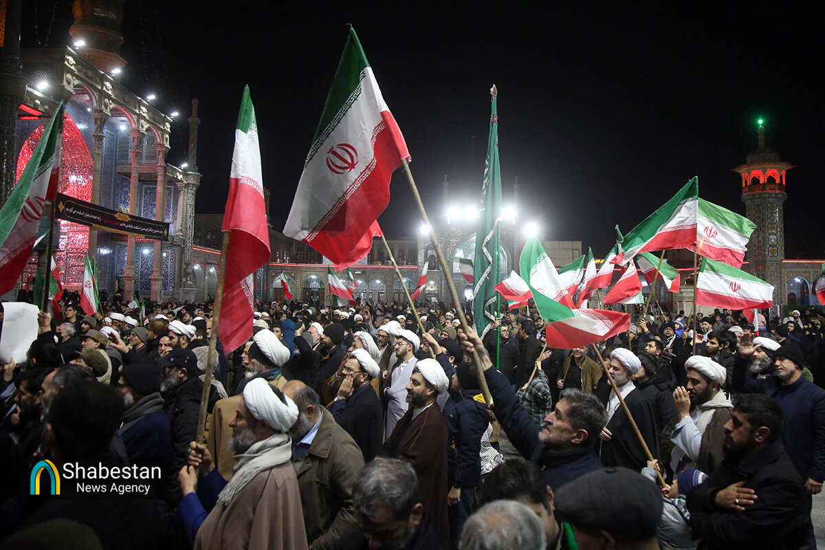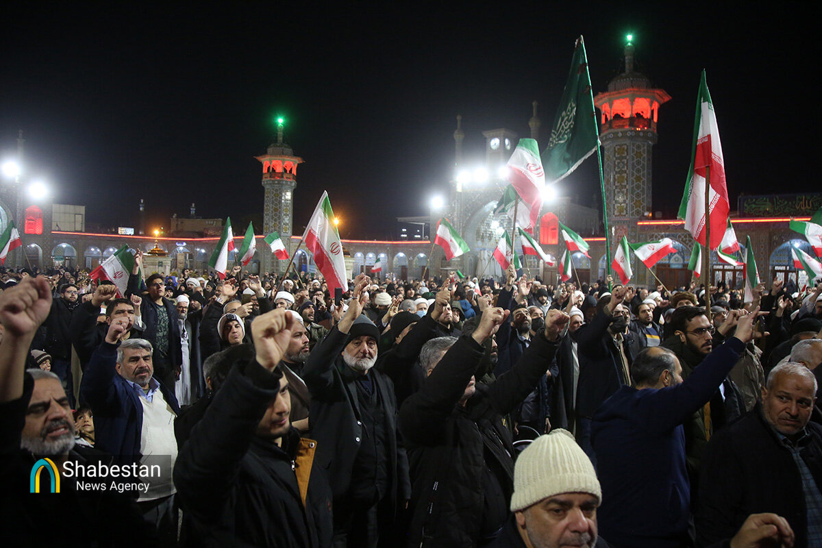 مردم انقلابی و همیشه در صحنه قم با همراهی هیئتهای مذهبی همزمان با شام رحلت حضرت زینب کبری سلام الله علیها با حضور پرشور در صحن امام رضا علیه السلام حرم مطهر حضرت فاطمه معصومه سلام الله علیها علیه اغتشاش گران و برهنه زنندگان نظم کشور تجمع کردند.
