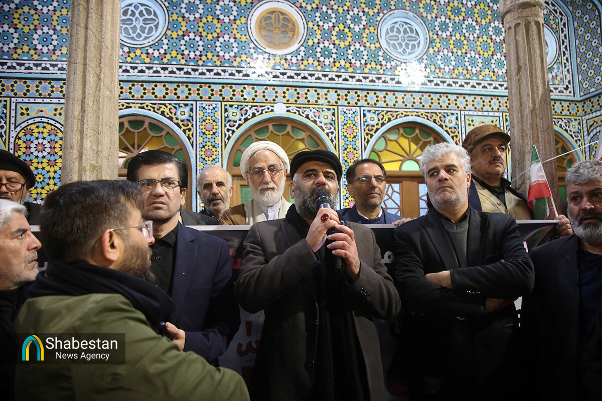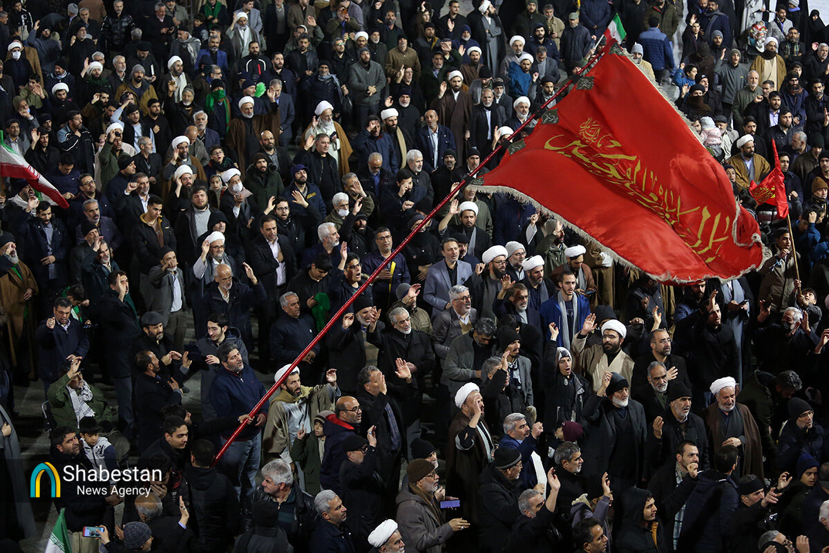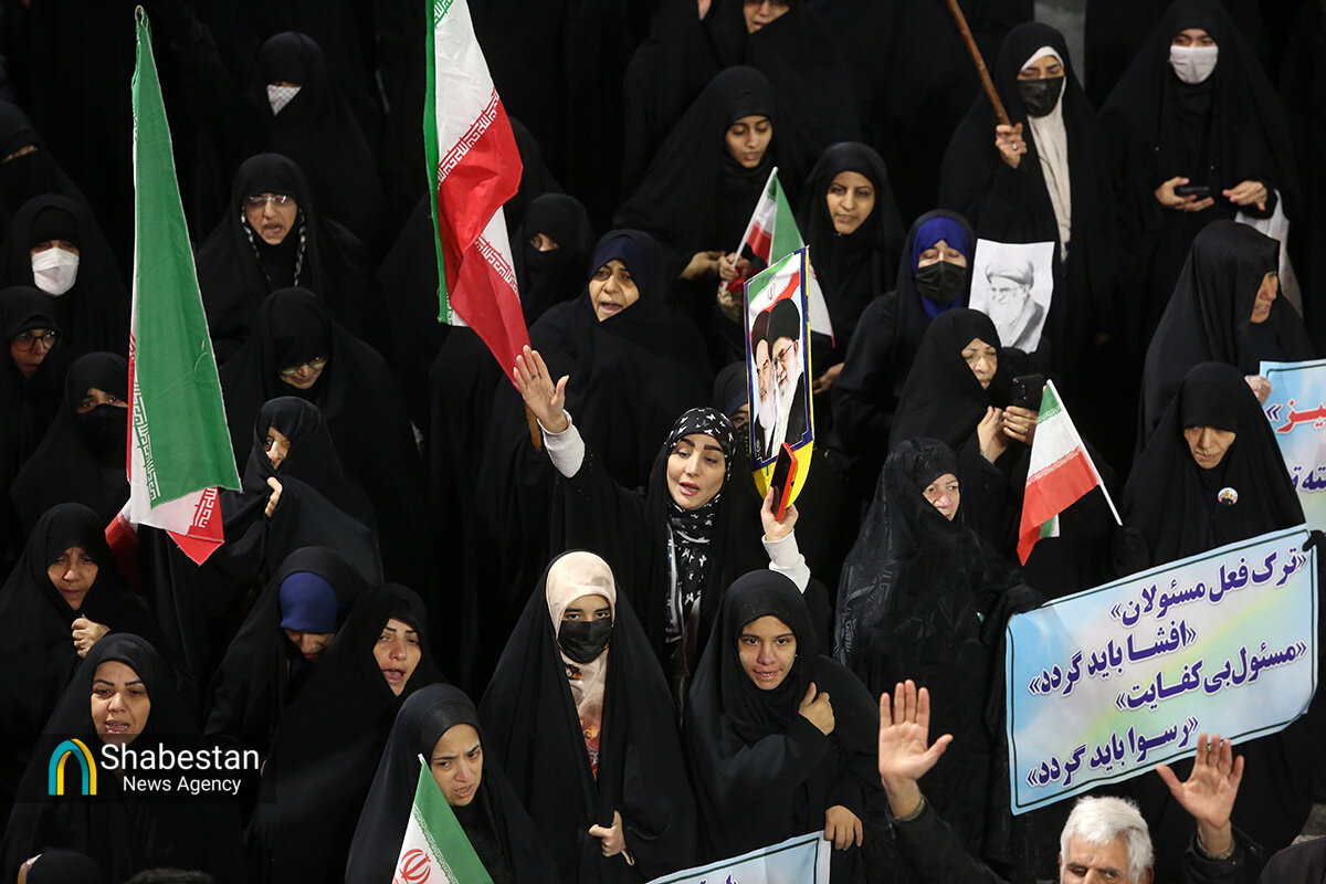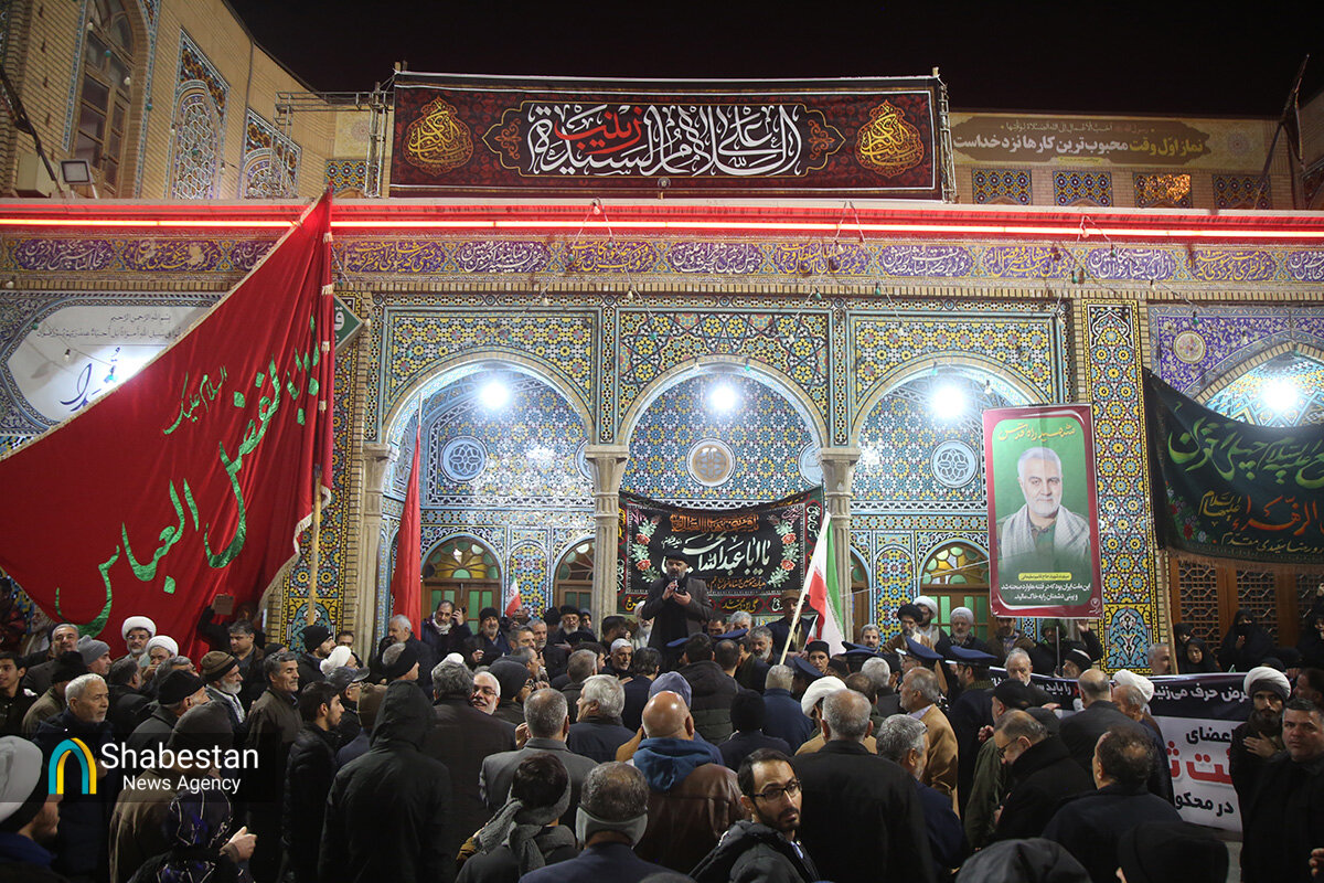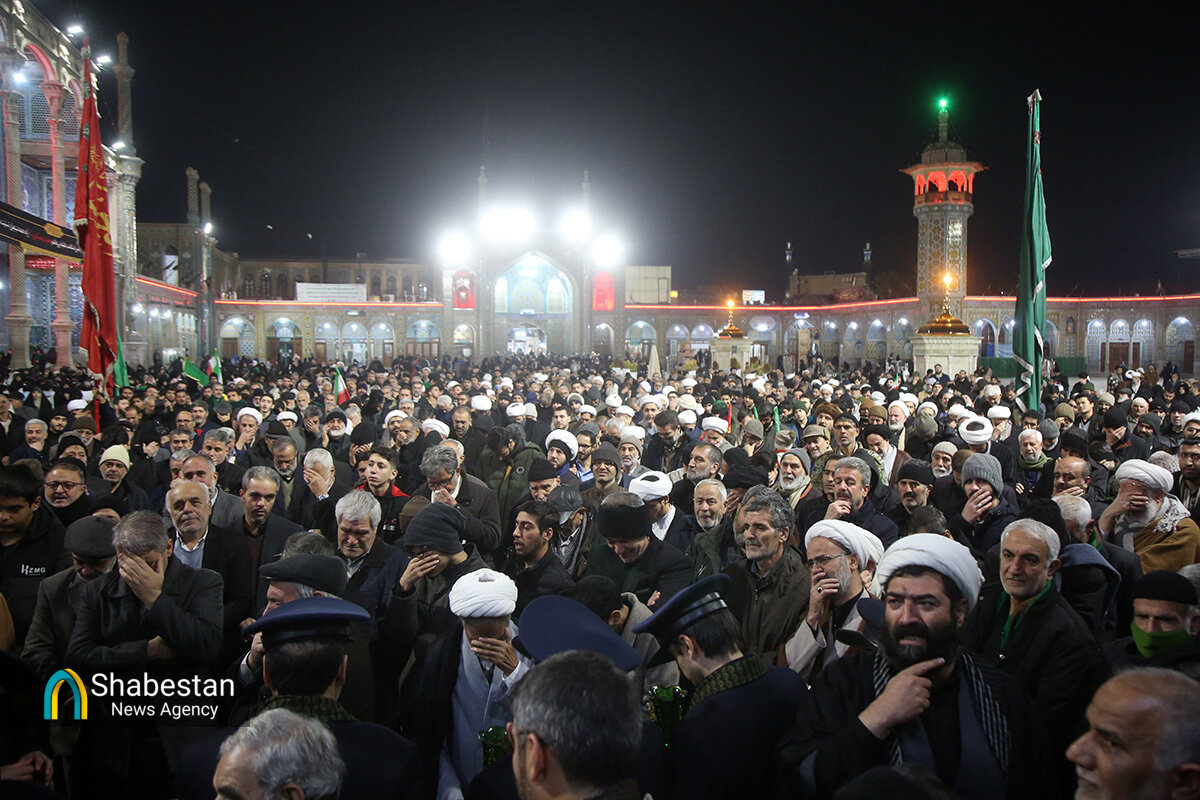مردم انقلابی و همیشه در صحنه قم با همراهی هیئتهای مذهبی همزمان با شام رحلت حضرت زینب کبری سلام الله علیها با حضور پرشور در صحن امام رضا علیه السلام حرم مطهر حضرت فاطمه معصومه سلام الله علیها علیه اغتشاش گران و برهنه زنندگان نظم کشور تجمع کردند.