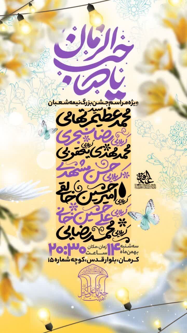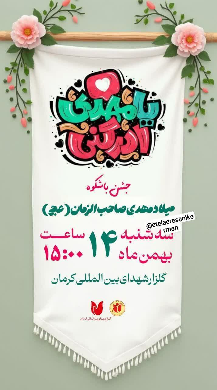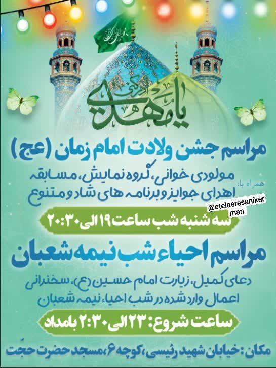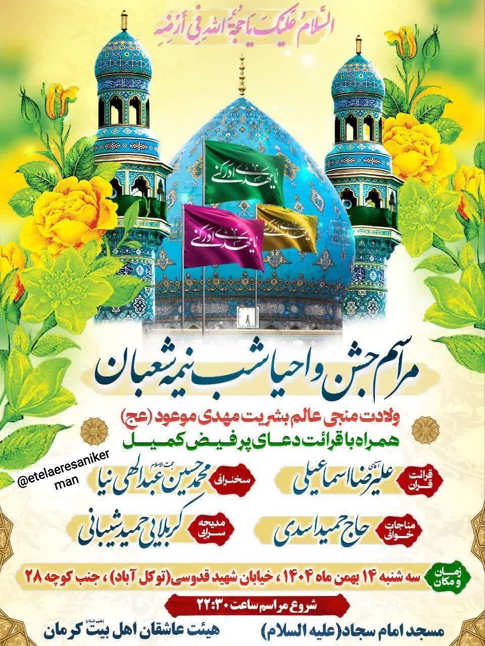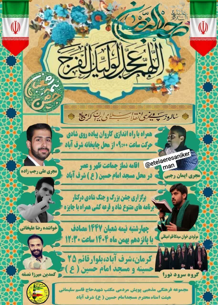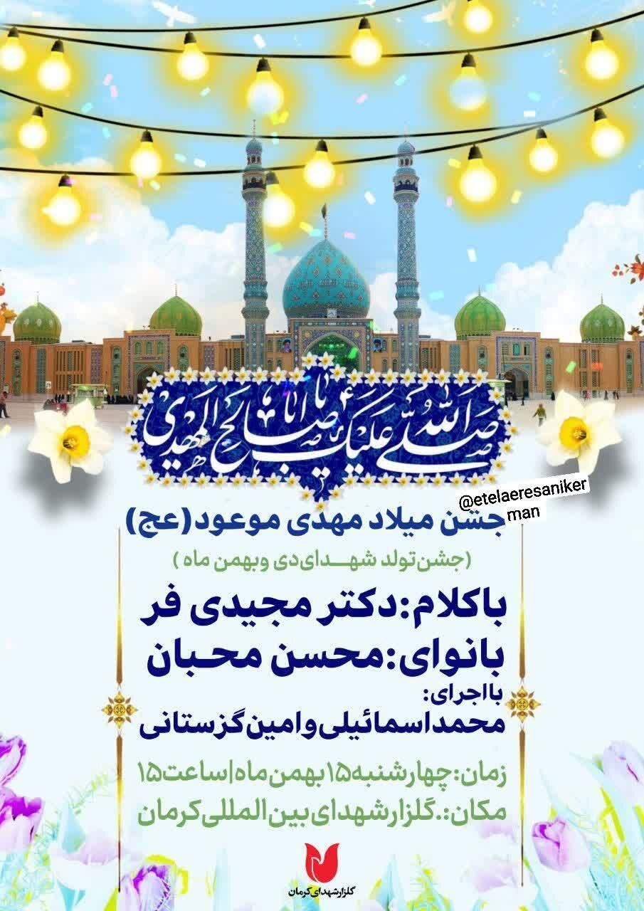 همزمان با نیمه شعبان، سالروز میلاد مسعود حضرت مهدی موعود عجلالله تعالی فرجه الشریف مراسم جشن و سرور در نقاط مختلف استان و بیش از ۵۰ نقطه از شهر کرمان برگزار میشود.