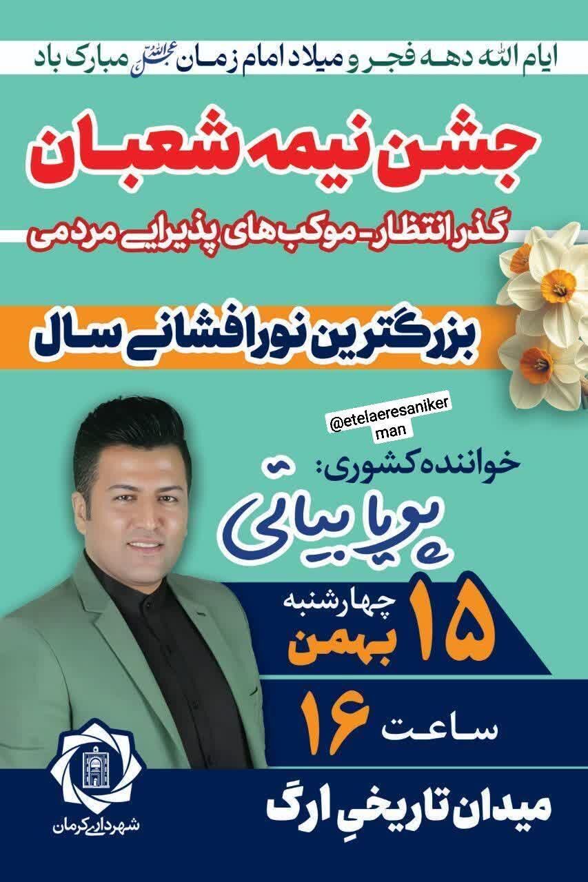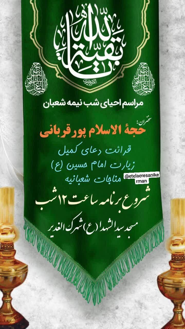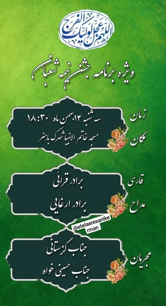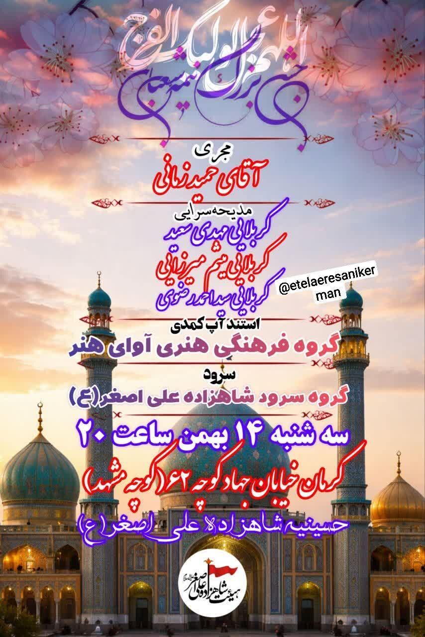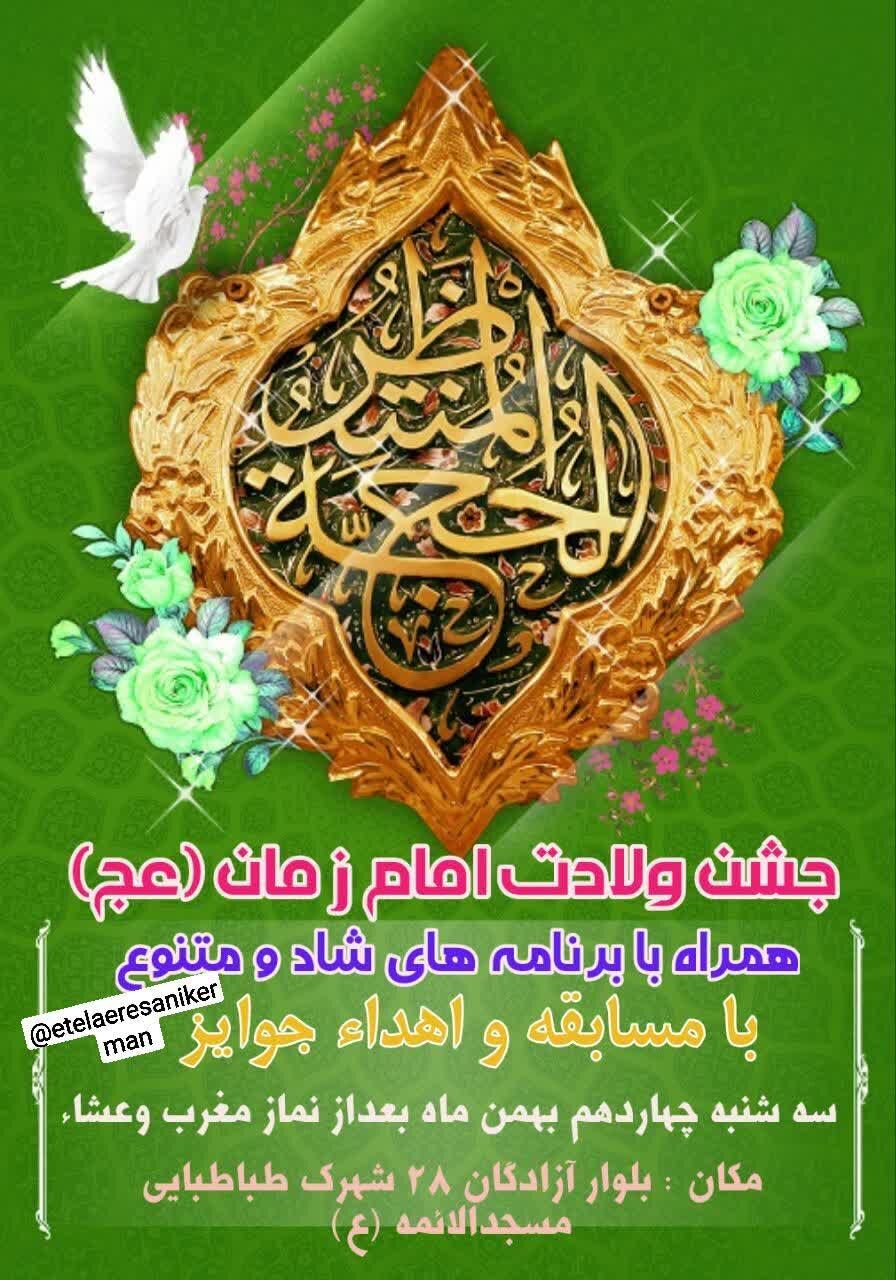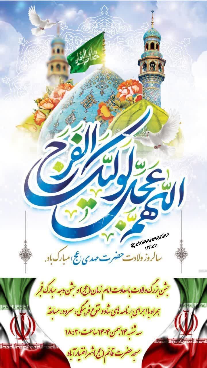 همزمان با نیمه شعبان، سالروز میلاد مسعود حضرت مهدی موعود عجلالله تعالی فرجه الشریف مراسم جشن و سرور در نقاط مختلف استان و بیش از ۵۰ نقطه از شهر کرمان برگزار میشود.