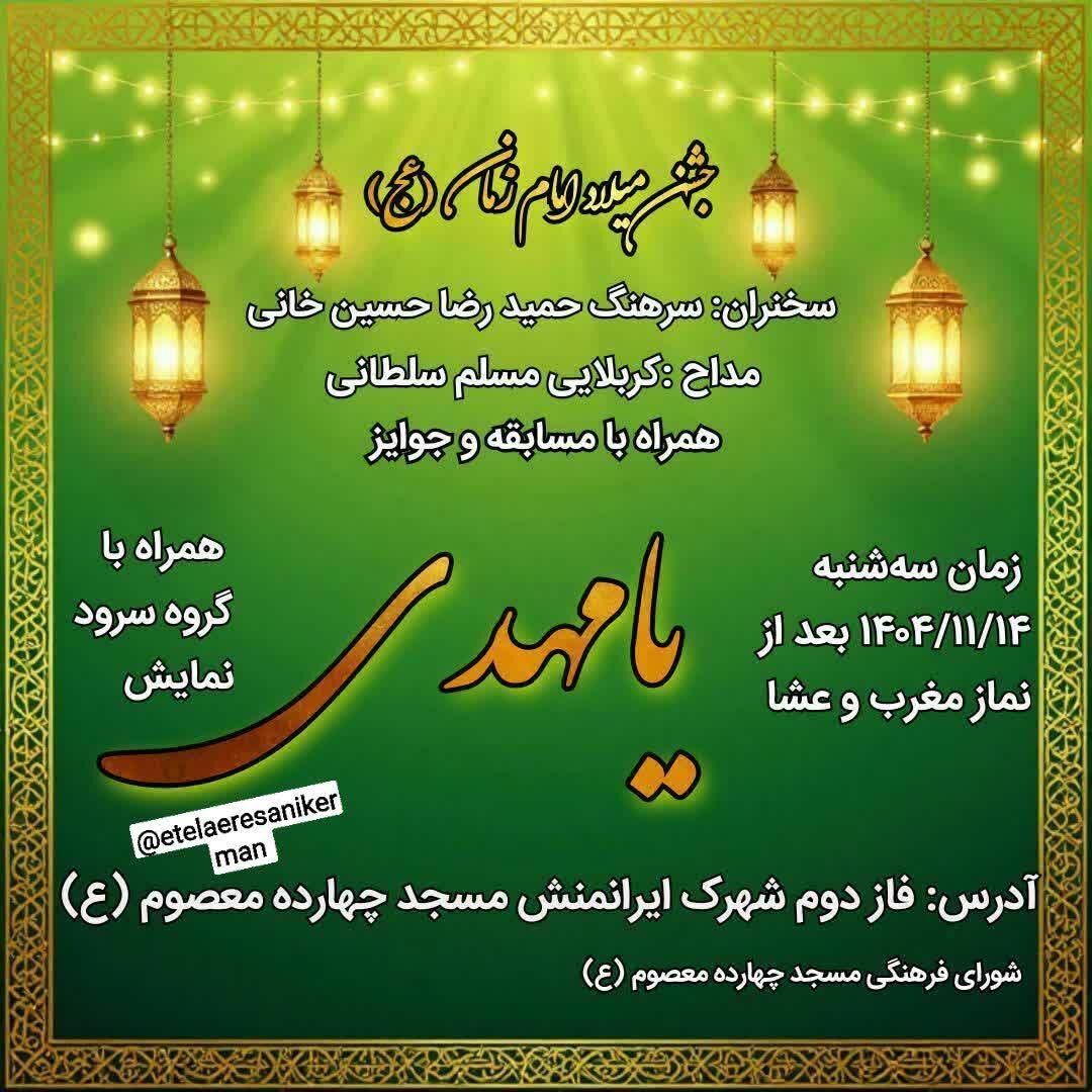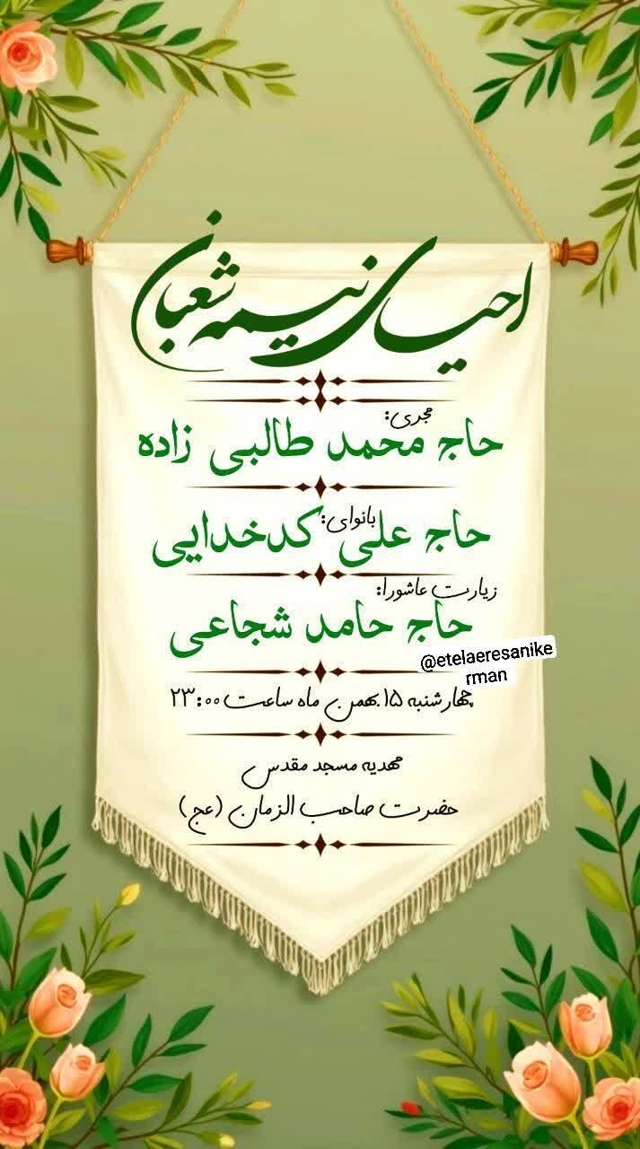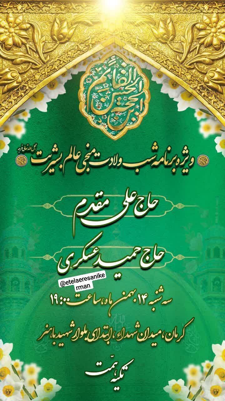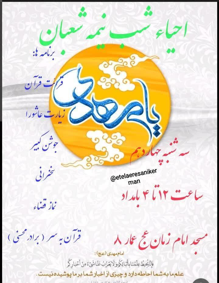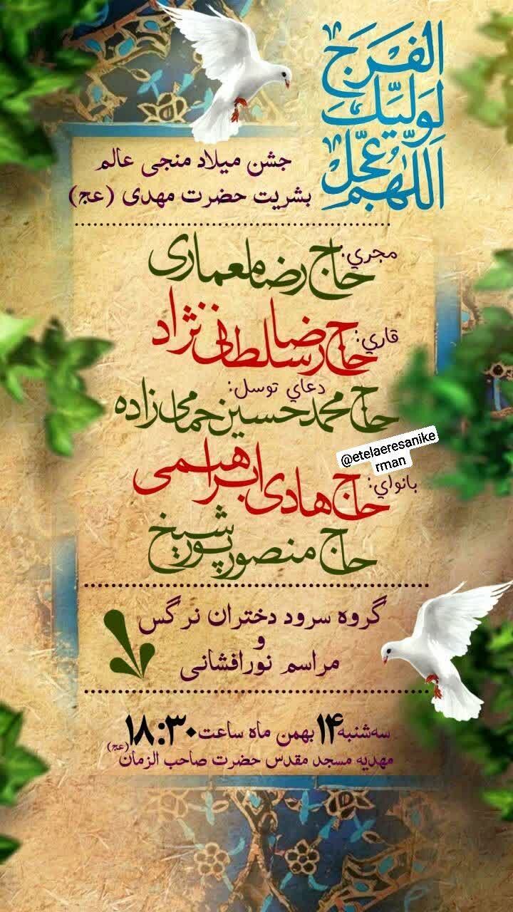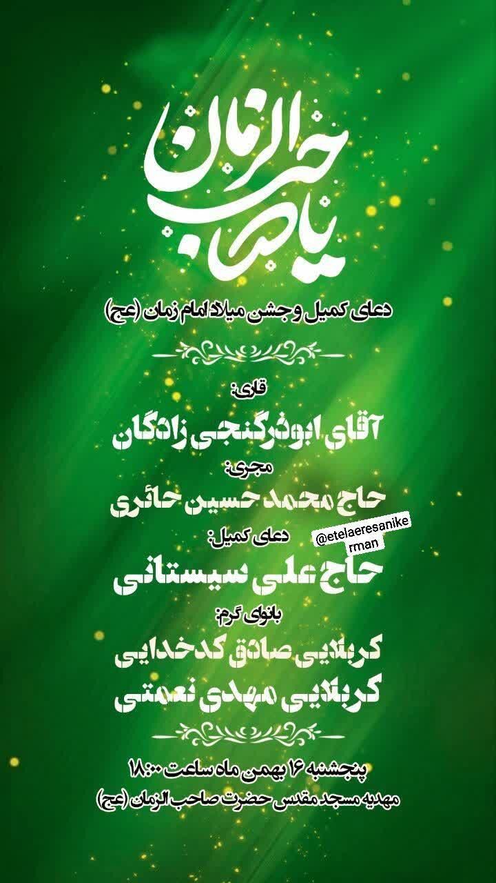 همزمان با نیمه شعبان، سالروز میلاد مسعود حضرت مهدی موعود عجلالله تعالی فرجه الشریف مراسم جشن و سرور در نقاط مختلف استان و بیش از ۵۰ نقطه از شهر کرمان برگزار میشود.