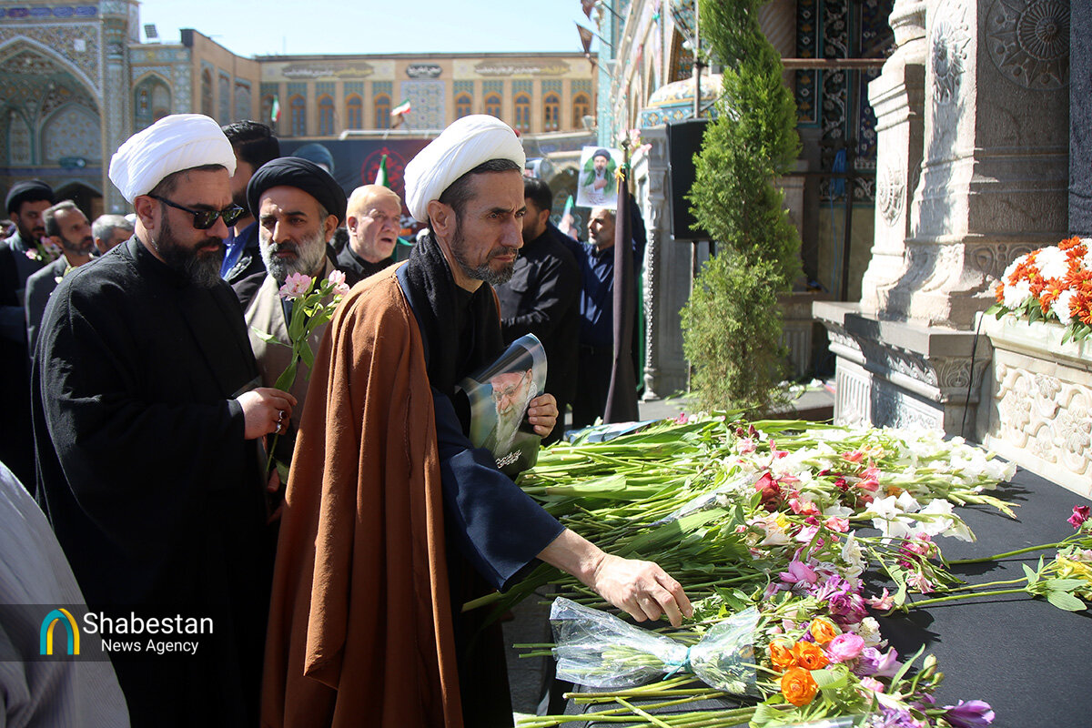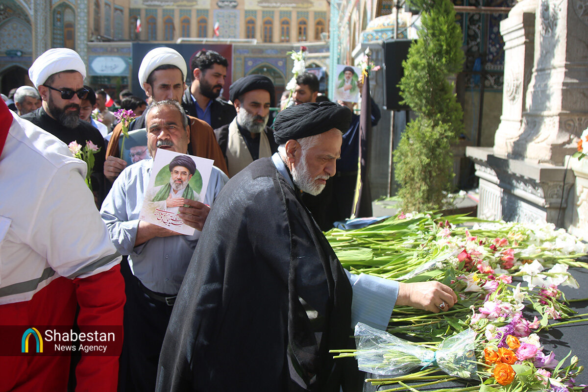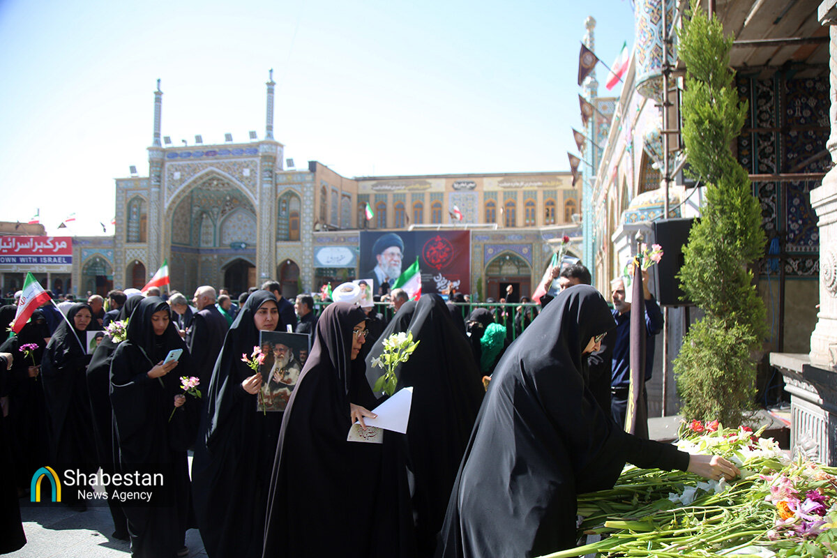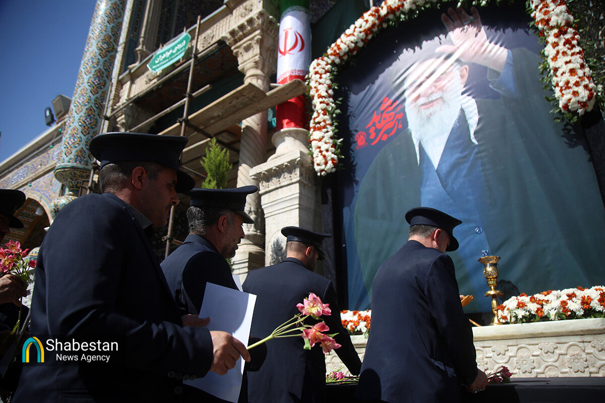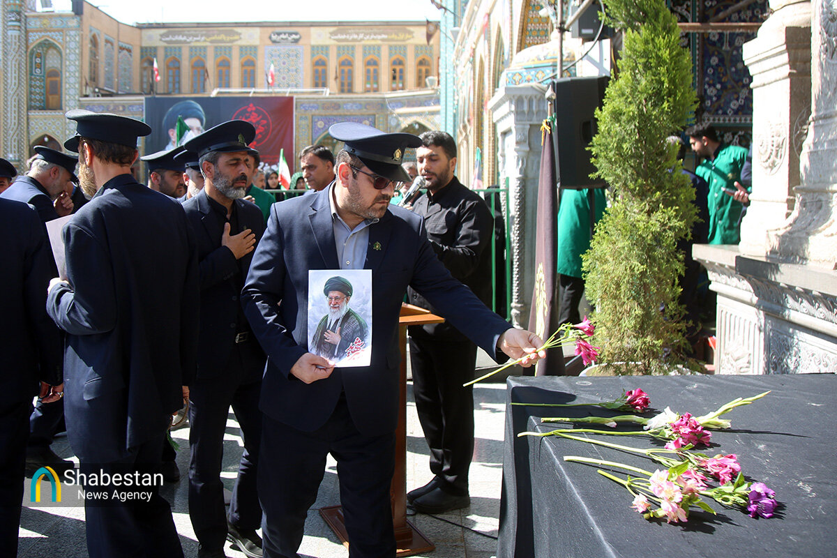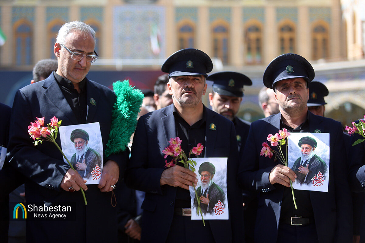 آیین ادای احترام و اهدای گل به یادمان شهید آیت الله امام سید علی خامنه ای (قدس سره) به مناسبت چهلمین روز شهادت رهبر شهید انقلاب امروز با حضور پرشور خادمان حرم مطهر بانوی کرامت و اقشار مختلف مردم در صحن امام رضا علیه السلام حرم حضرت فاطمه معصومه سلام الله علیها برگزار شد.