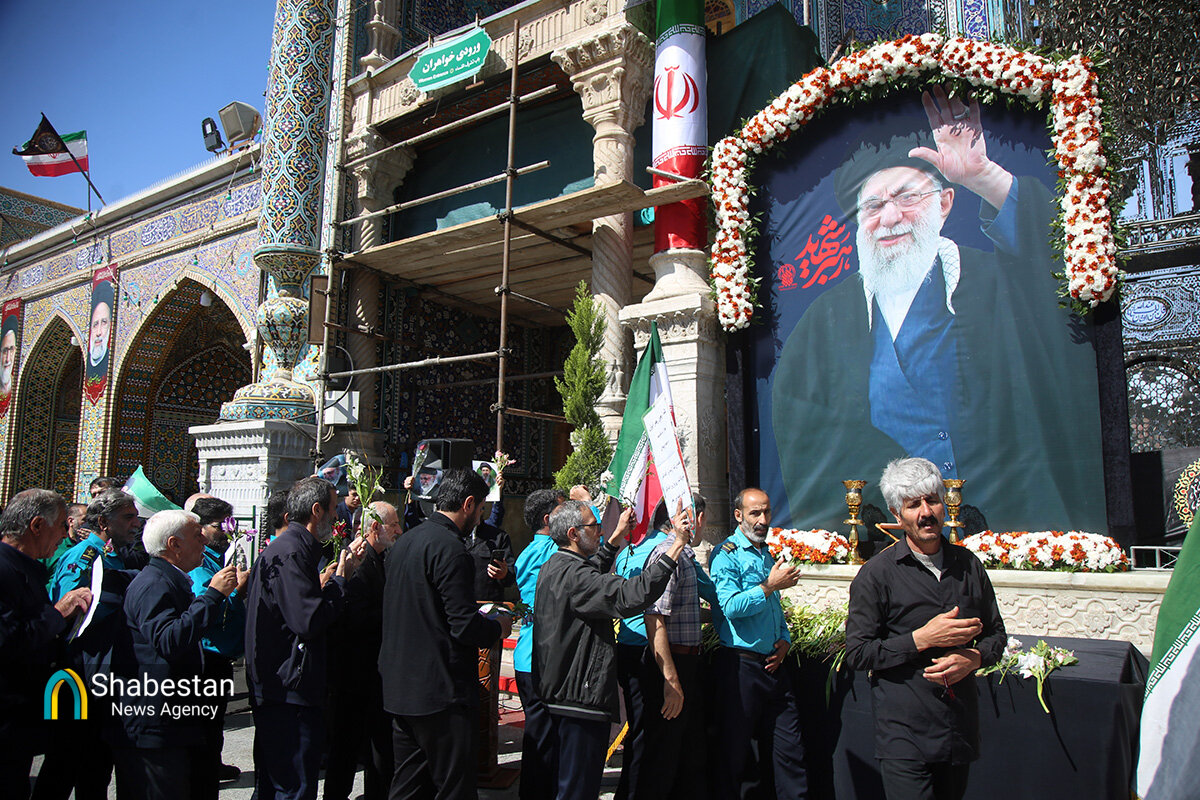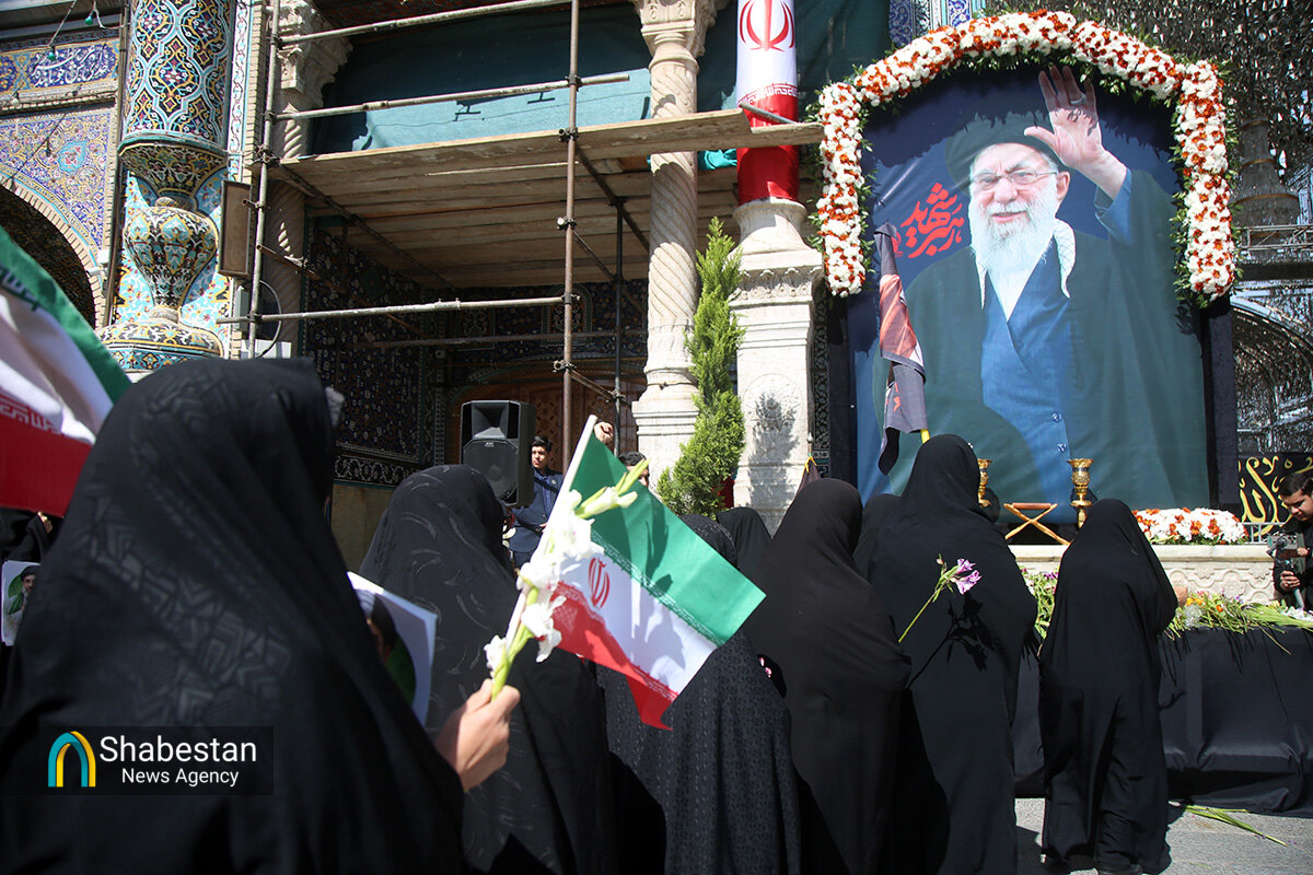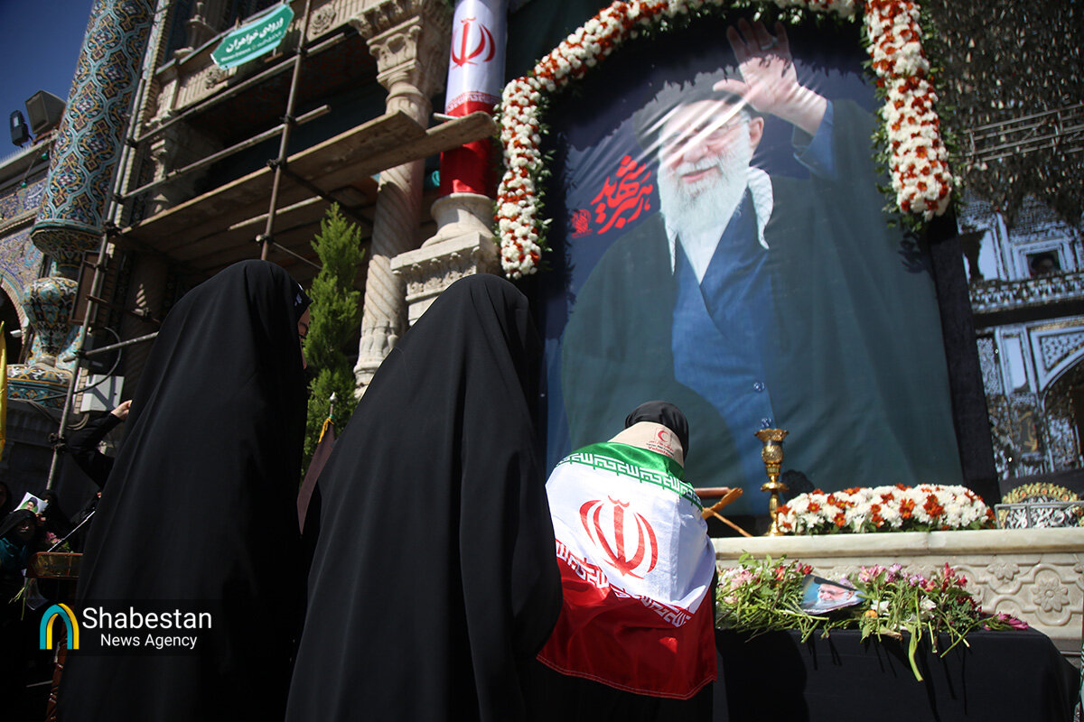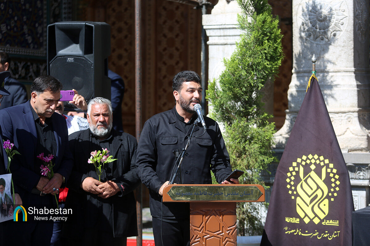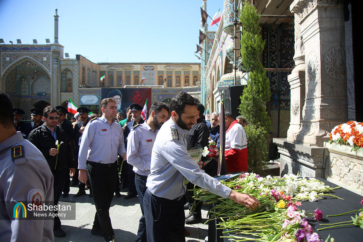 آیین ادای احترام و اهدای گل به یادمان شهید آیت الله امام سید علی خامنه ای (قدس سره) به مناسبت چهلمین روز شهادت رهبر شهید انقلاب امروز با حضور پرشور خادمان حرم مطهر بانوی کرامت و اقشار مختلف مردم در صحن امام رضا علیه السلام حرم حضرت فاطمه معصومه سلام الله علیها برگزار شد.