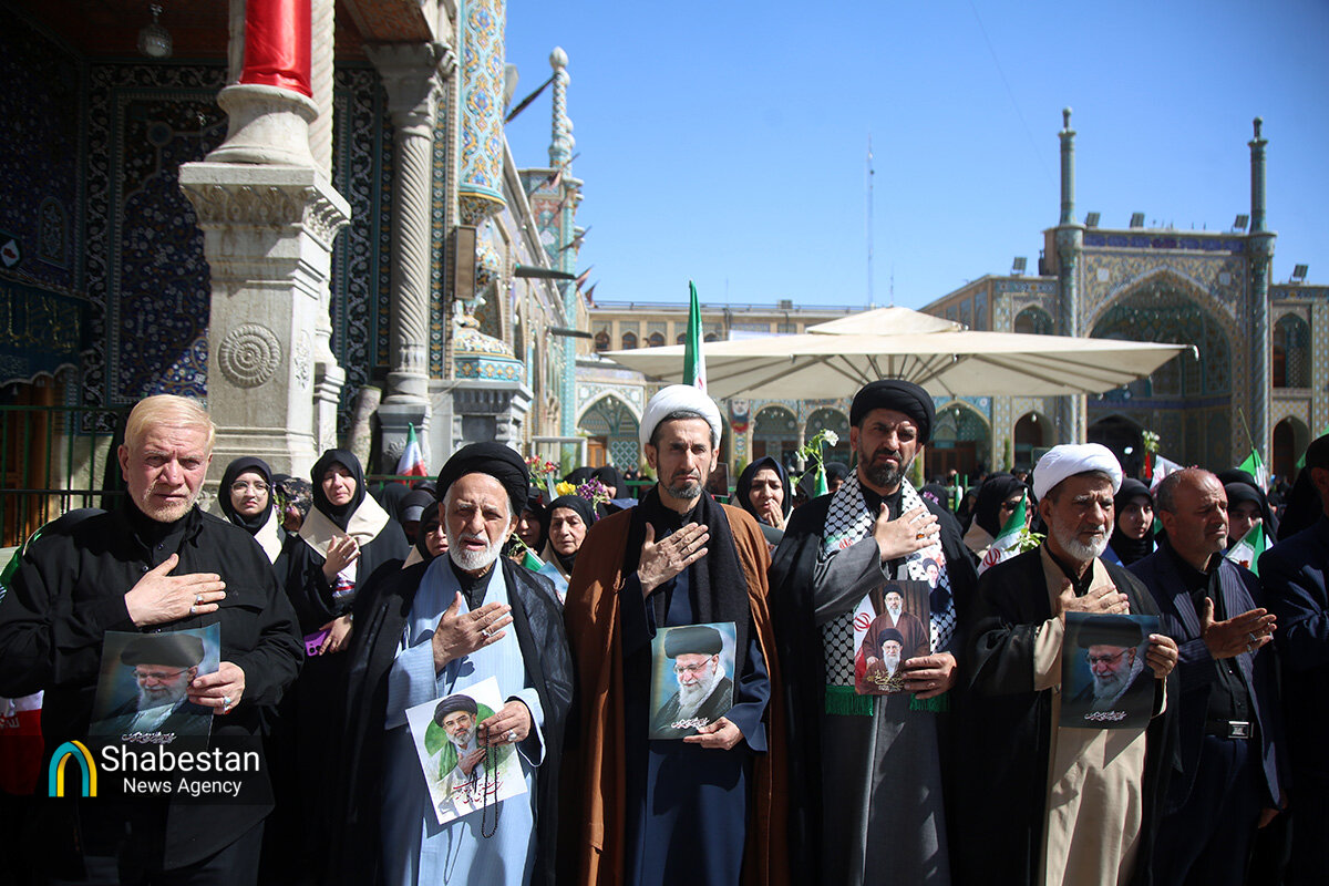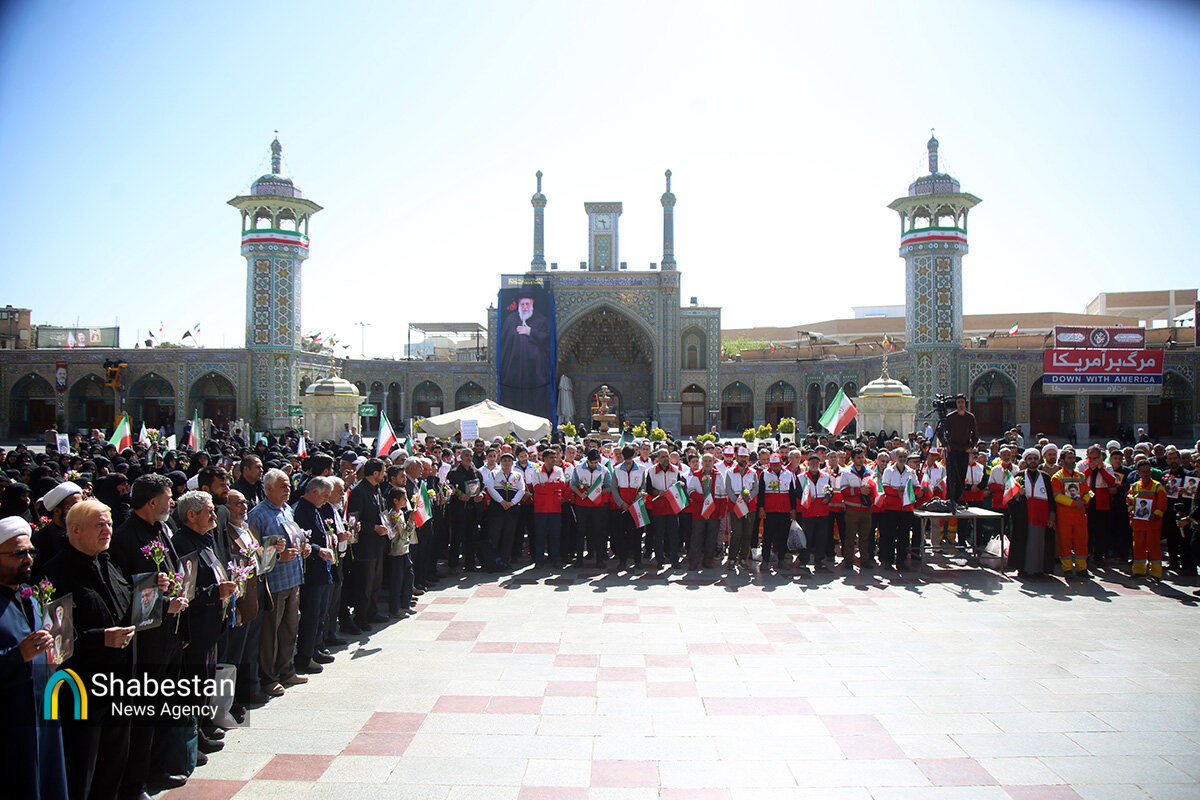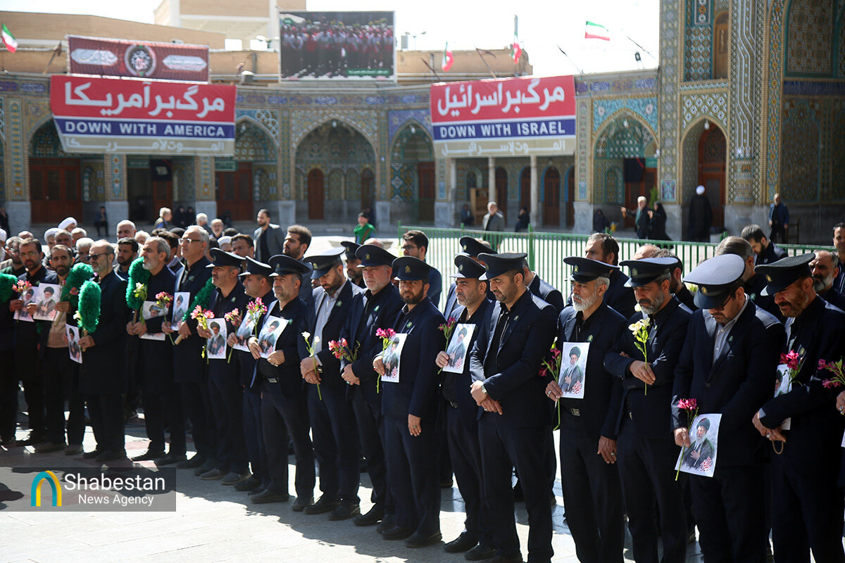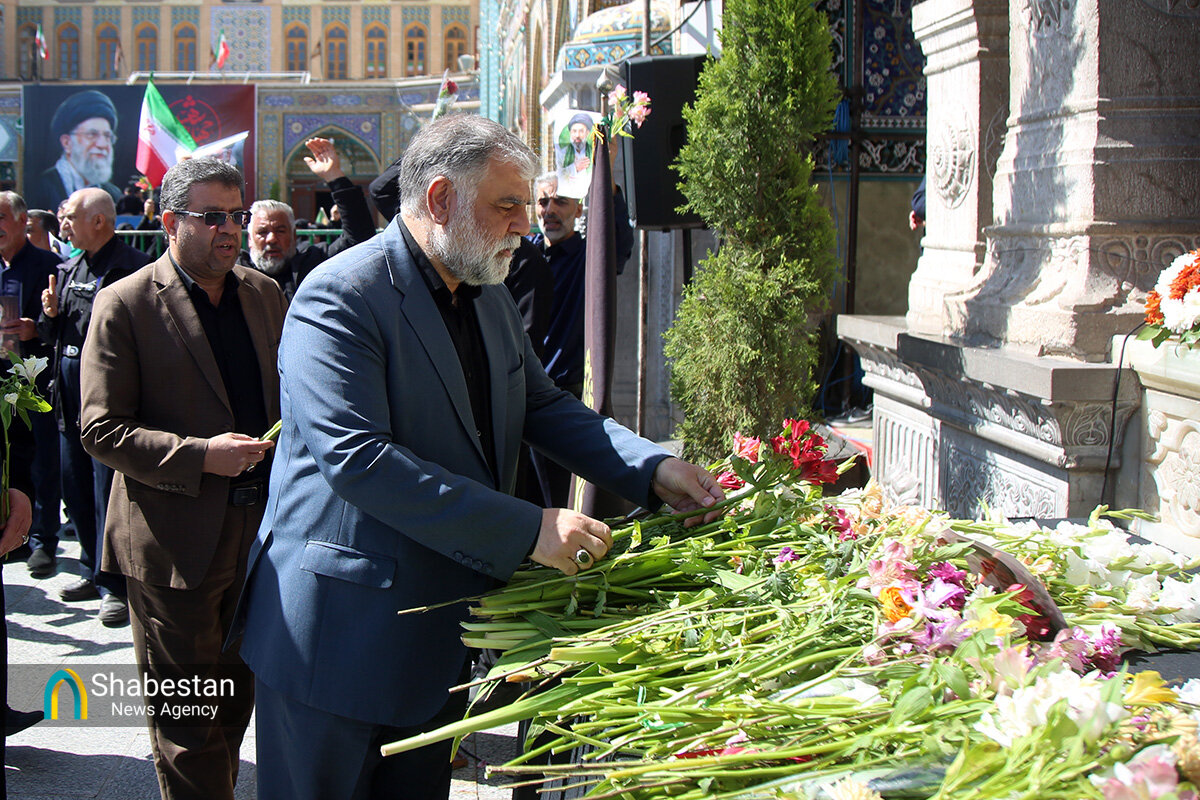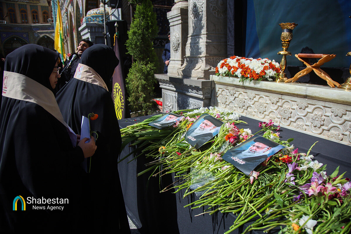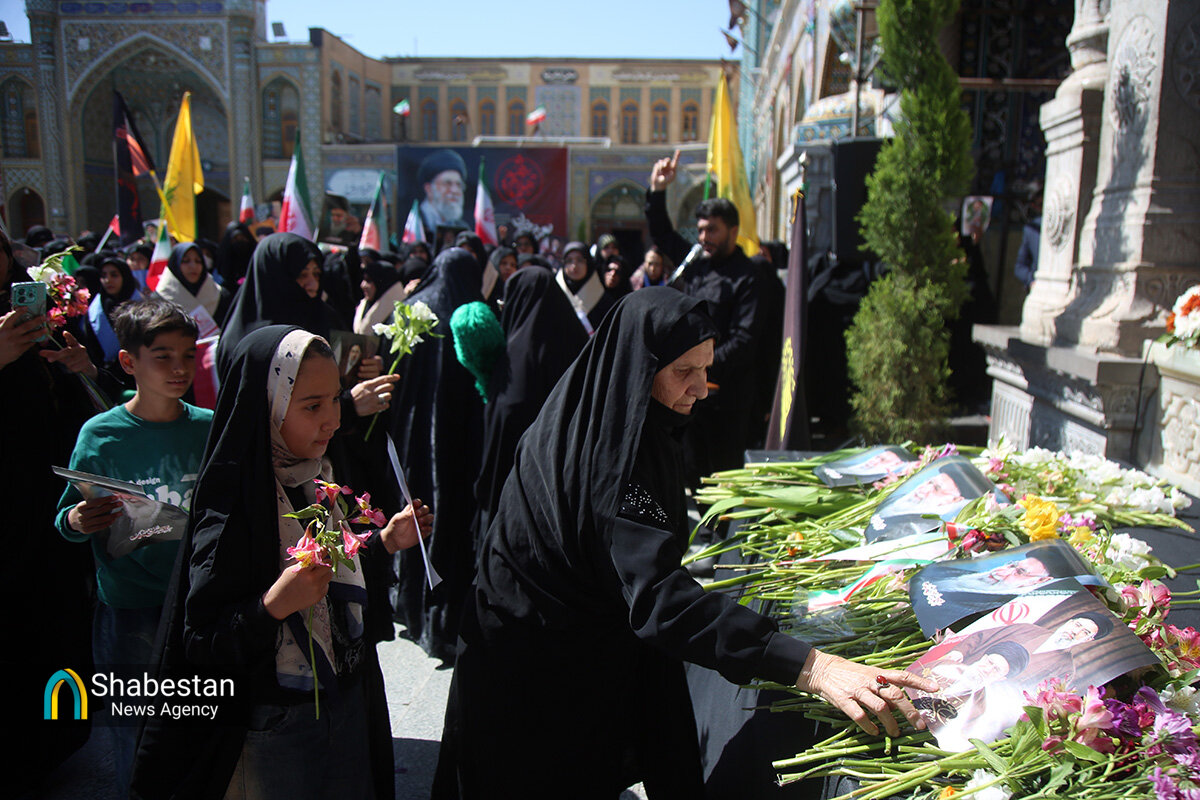 آیین ادای احترام و اهدای گل به یادمان شهید آیت الله امام سید علی خامنه ای (قدس سره) به مناسبت چهلمین روز شهادت رهبر شهید انقلاب امروز با حضور پرشور خادمان حرم مطهر بانوی کرامت و اقشار مختلف مردم در صحن امام رضا علیه السلام حرم حضرت فاطمه معصومه سلام الله علیها برگزار شد.