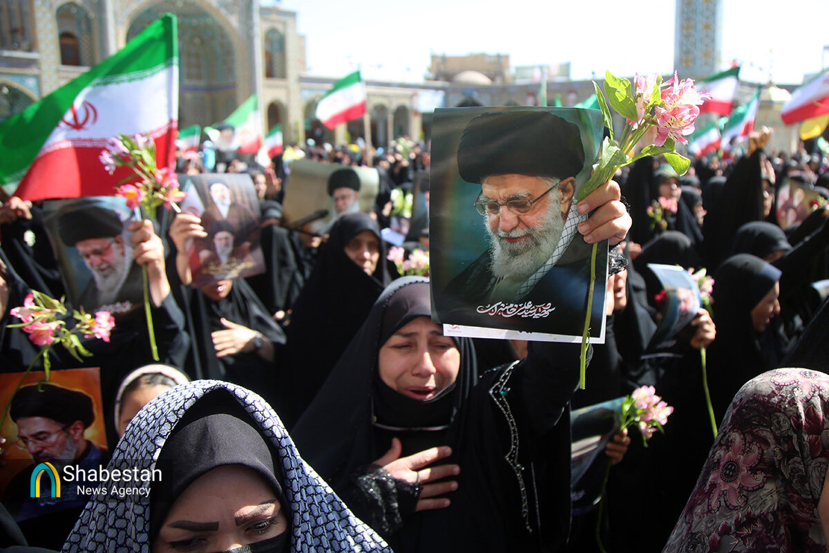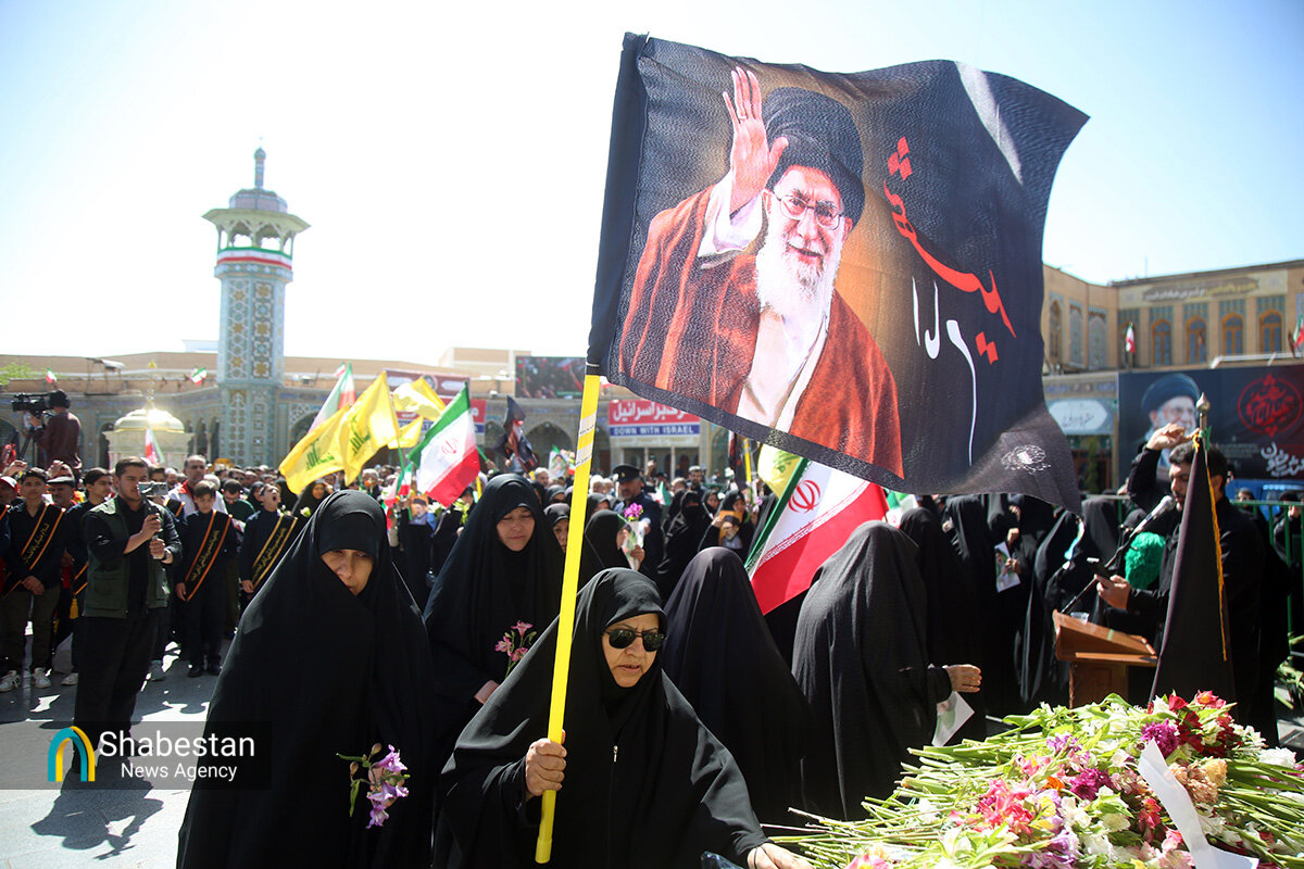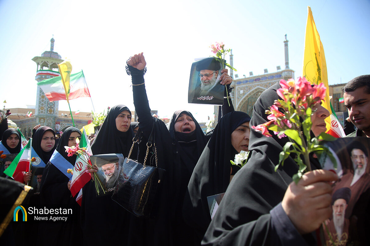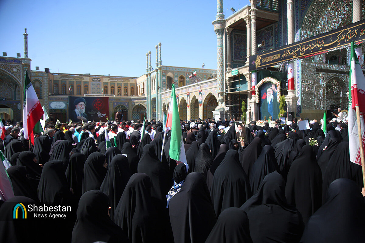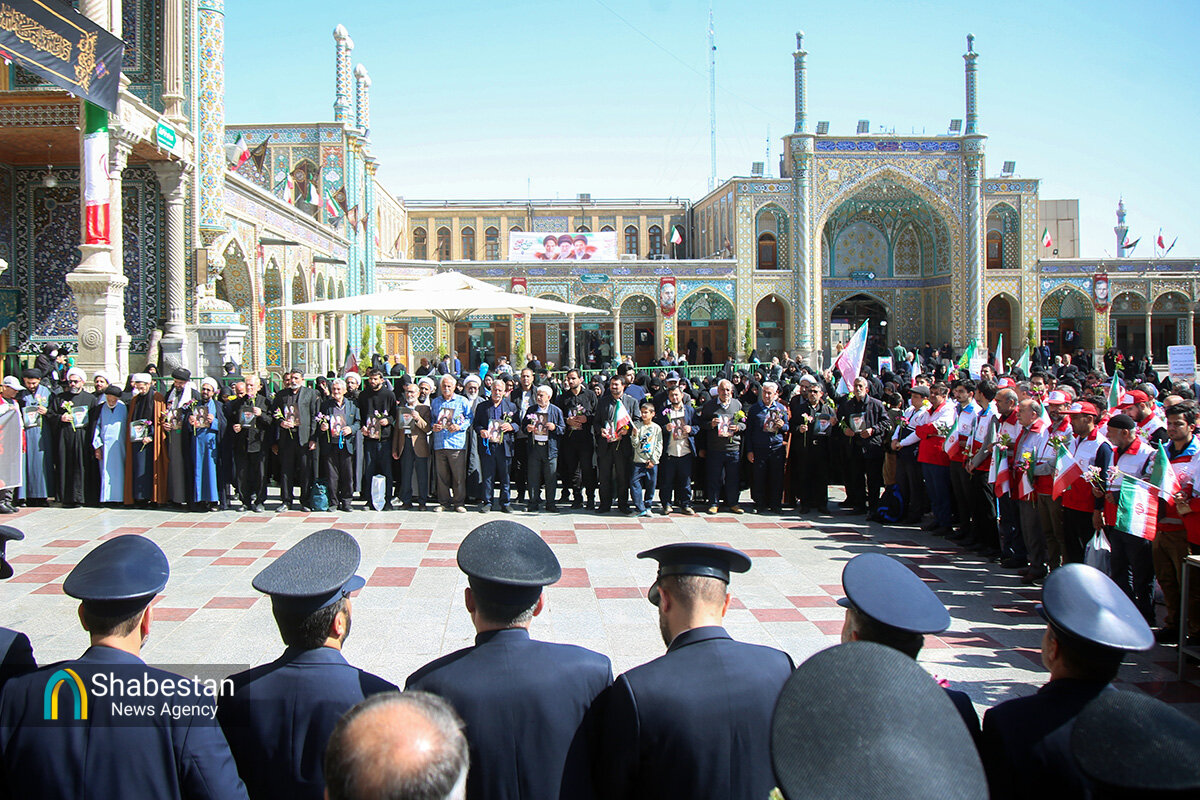 آیین ادای احترام و اهدای گل به یادمان شهید آیت الله امام سید علی خامنه ای (قدس سره) به مناسبت چهلمین روز شهادت رهبر شهید انقلاب امروز با حضور پرشور خادمان حرم مطهر بانوی کرامت و اقشار مختلف مردم در صحن امام رضا علیه السلام حرم حضرت فاطمه معصومه سلام الله علیها برگزار شد.